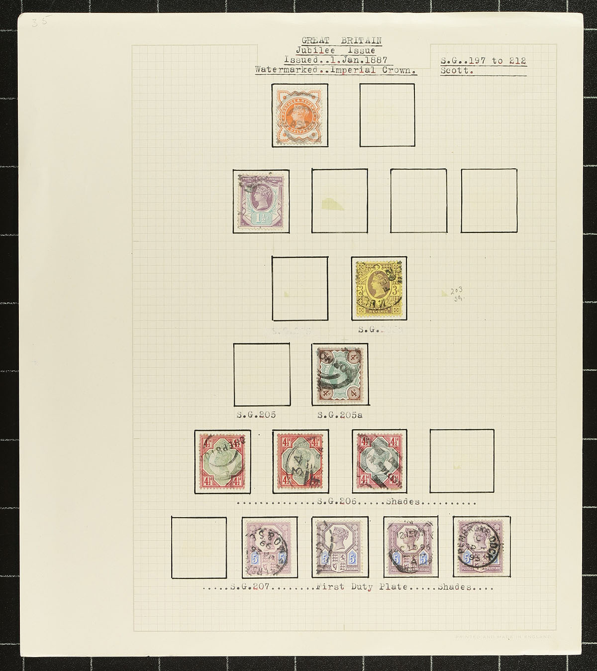 Accumulation of used Great Britain, 1840's-2001, containing a few thousand stamps in several album or stock pages, along with a few glassines. The lot generally ranges from Scott #3/2006, noting roughly 100 Victorian issues, Seahorses (2sh-5sh), back of the book issues, and more. A very quick check of material revealed Scott #s 3, 4, 26, 61 (x2, plate 11, 14), 99, 101, 140, along with several Jubilee issues, and more, noting several 'sock on the nose' town cancels. A nice accumulation for the Great Britain collector with potential finds for the dedicated collector. A few faults to be expected, overall fine to very fine. Estimate =