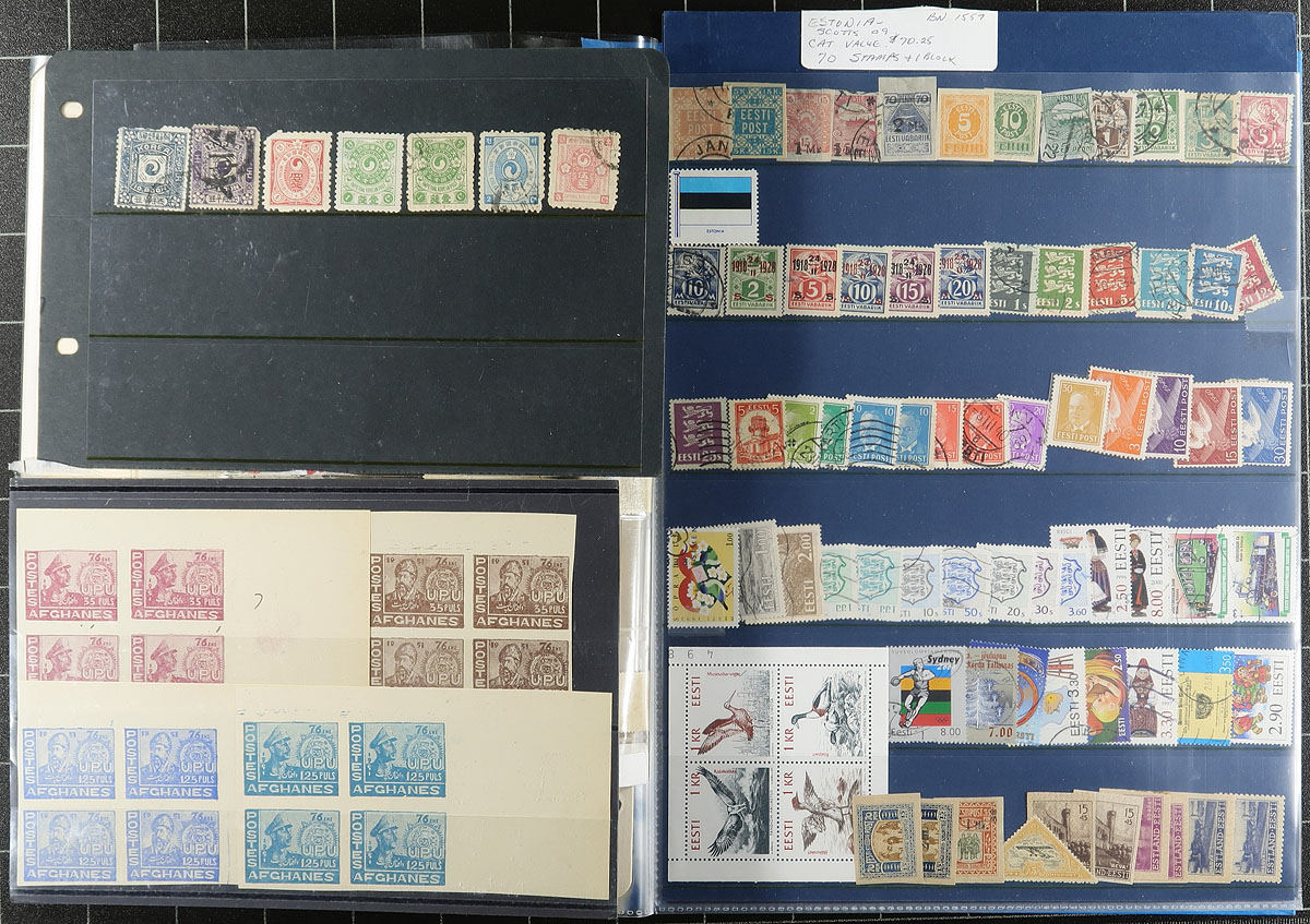 Eclectic accumulation of worldwide material including an old time album of many hundreds of used worldwide stamps, mint and used singles, souvenir sheets, and more in album or stock pages, glassines, etc. We note better representation from China and Japan, European countries, and more, with material appearing to range from the 1890s up to the 1970s, with material possible on either side of the given range. A spot check indicated a few items in the $10 to $20, leaving potential finds to the dedicated collector. Online photos show an overview of this interesting grouping. A few faults noted, overall fine to very fine. Estimate =