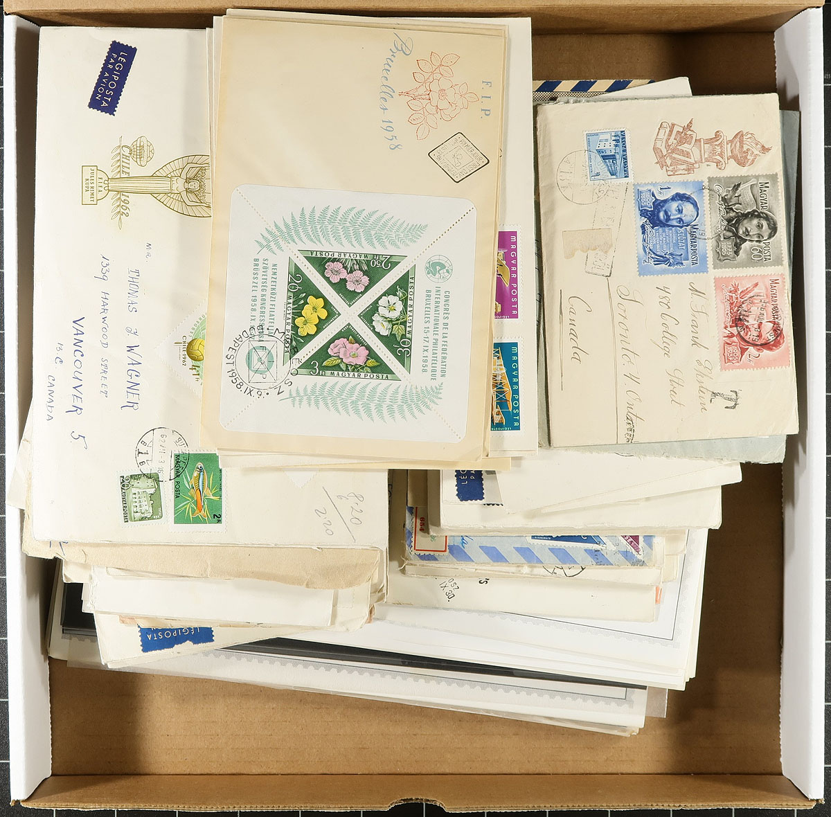 Group of roughly 160 Hungary coves, 1950's-1970s', with half being first day covers noting singles, sets, and souvenir sheet frankings (noting Scott #1202a (x2, c.v. $60 total as used stamps, along with imperforate souvenir sheet fdc c.v. $50), with the other half being maximum cards, along with a few postal stationery and first flight covers. An interesting mix with condition being mixed to very fine due to the size of the covers. A nice lot with many thematic or topical possibilities. Estimate =