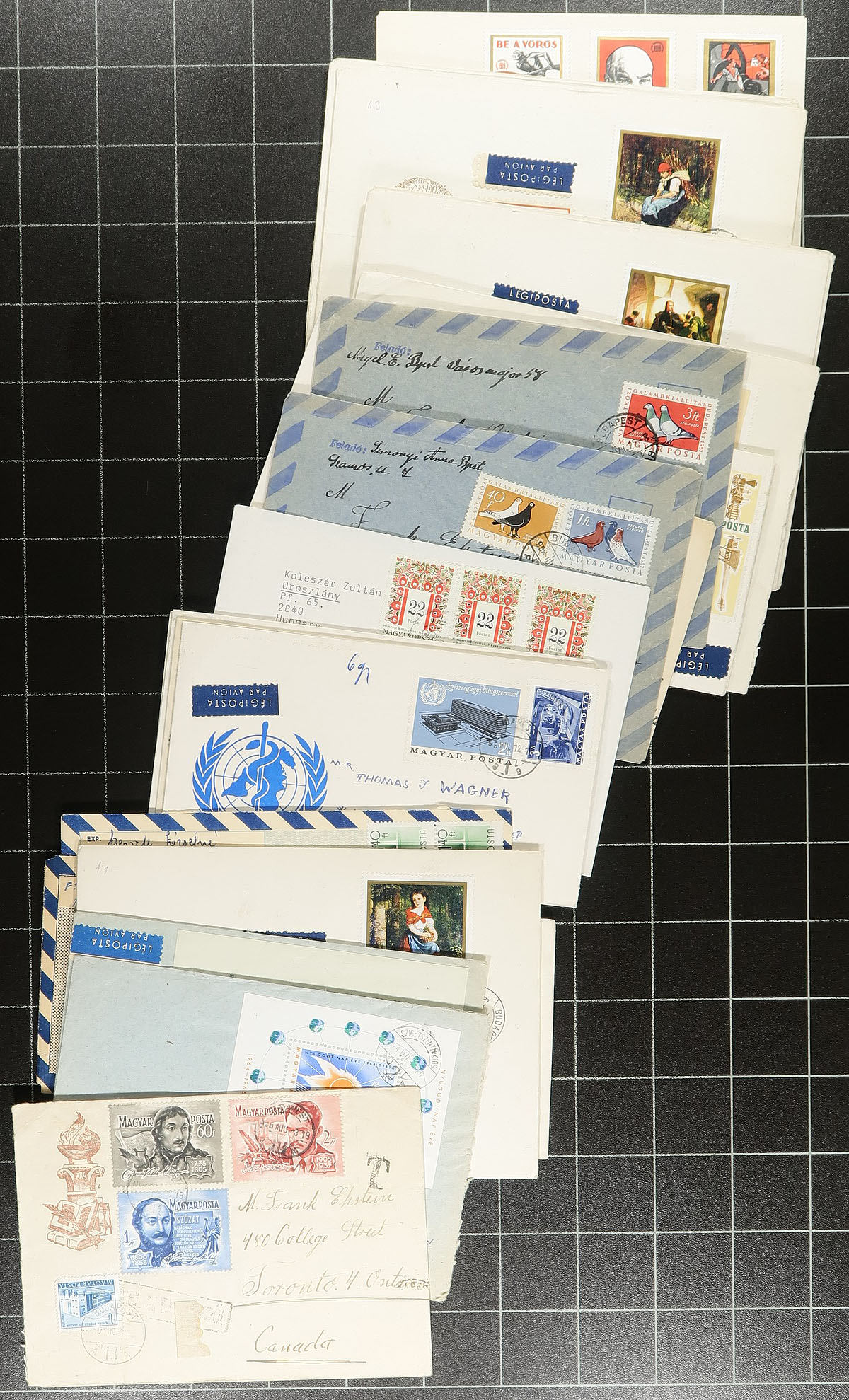 Group of roughly 160 Hungary coves, 1950's-1970s', with half being first day covers noting singles, sets, and souvenir sheet frankings (noting Scott #1202a (x2, c.v. $60 total as used stamps, along with imperforate souvenir sheet fdc c.v. $50), with the other half being maximum cards, along with a few postal stationery and first flight covers. An interesting mix with condition being mixed to very fine due to the size of the covers. A nice lot with many thematic or topical possibilities. Estimate =