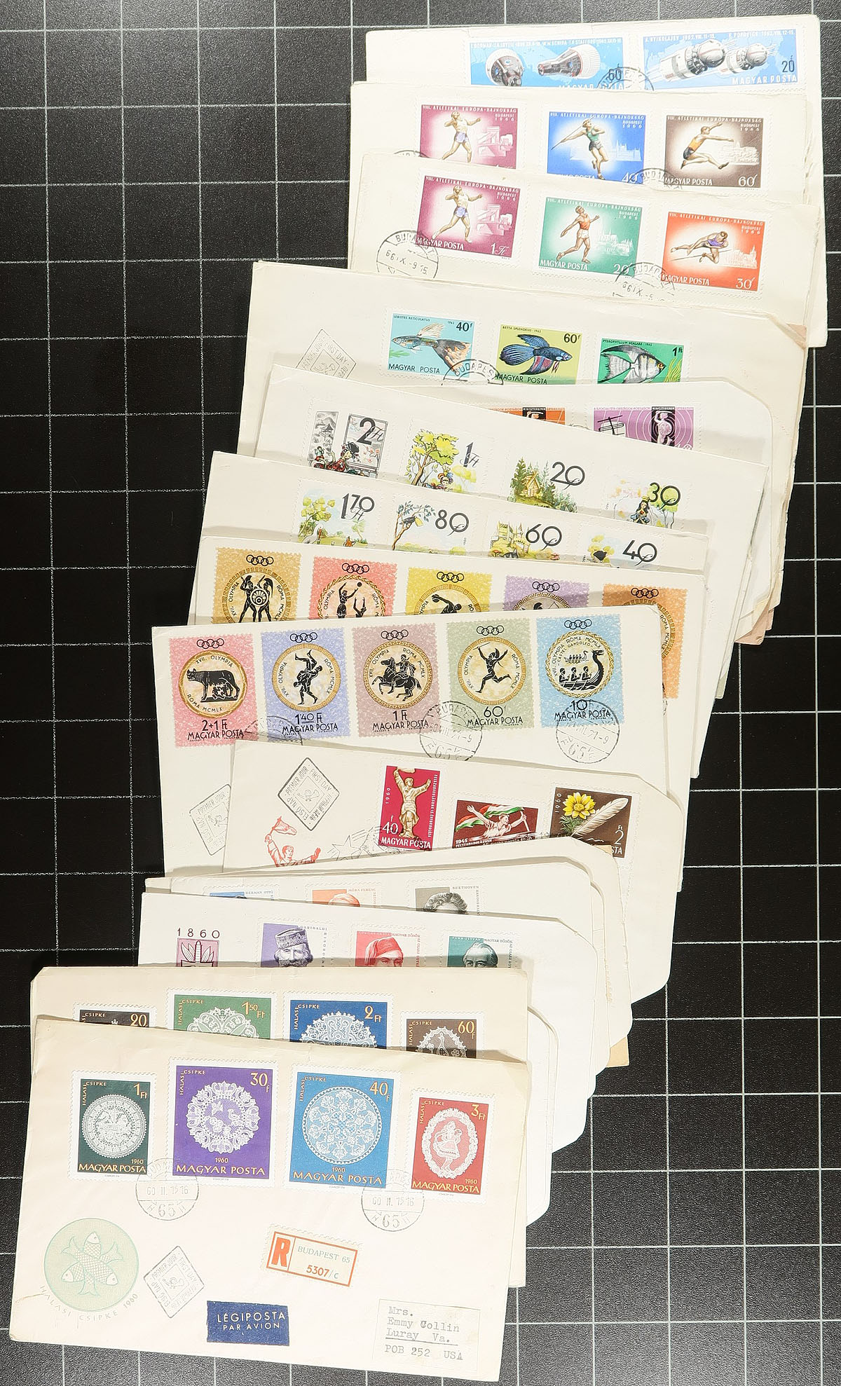 Group of roughly 160 Hungary coves, 1950's-1970s', with half being first day covers noting singles, sets, and souvenir sheet frankings (noting Scott #1202a (x2, c.v. $60 total as used stamps, along with imperforate souvenir sheet fdc c.v. $50), with the other half being maximum cards, along with a few postal stationery and first flight covers. An interesting mix with condition being mixed to very fine due to the size of the covers. A nice lot with many thematic or topical possibilities. Estimate =