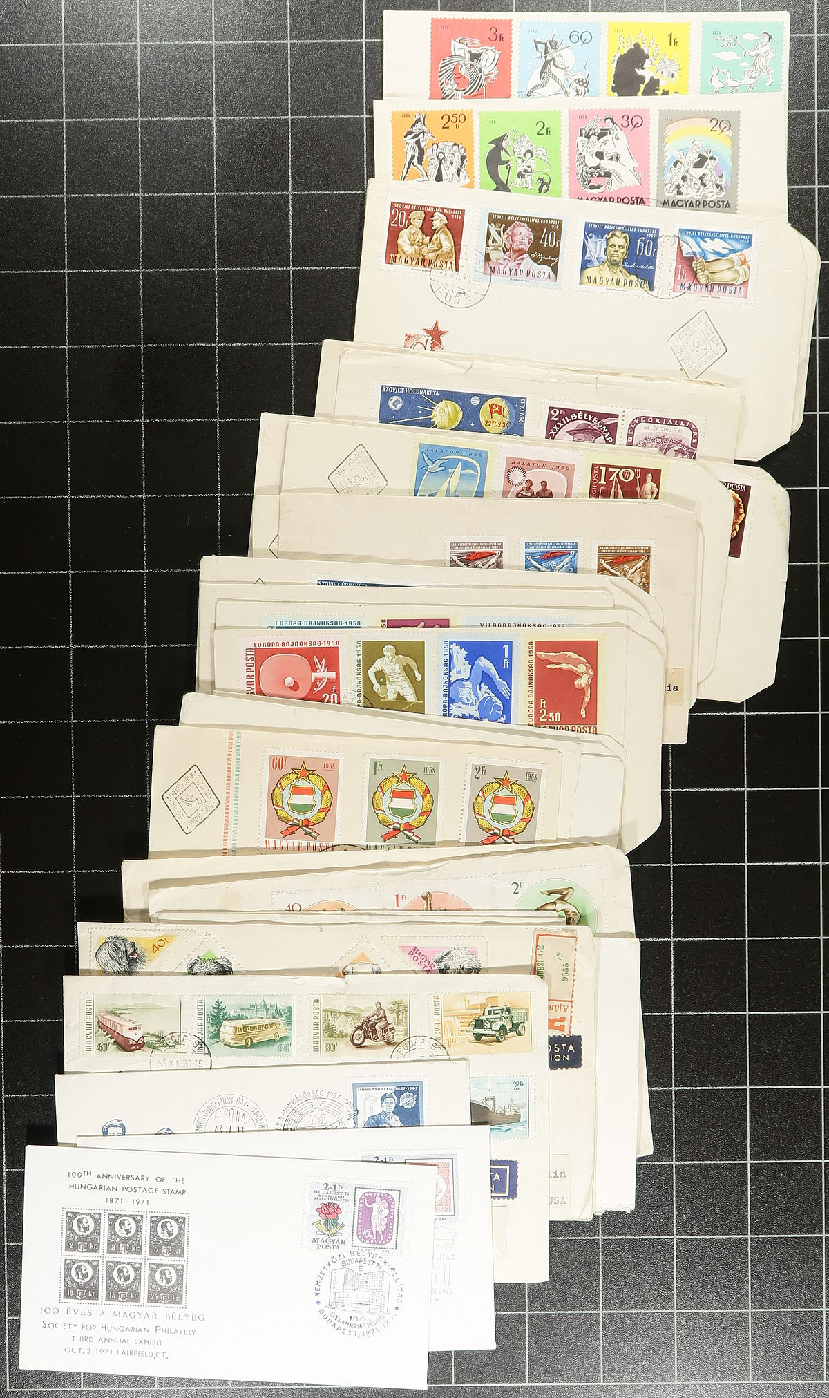 Group of roughly 160 Hungary coves, 1950's-1970s', with half being first day covers noting singles, sets, and souvenir sheet frankings (noting Scott #1202a (x2, c.v. $60 total as used stamps, along with imperforate souvenir sheet fdc c.v. $50), with the other half being maximum cards, along with a few postal stationery and first flight covers. An interesting mix with condition being mixed to very fine due to the size of the covers. A nice lot with many thematic or topical possibilities. Estimate =