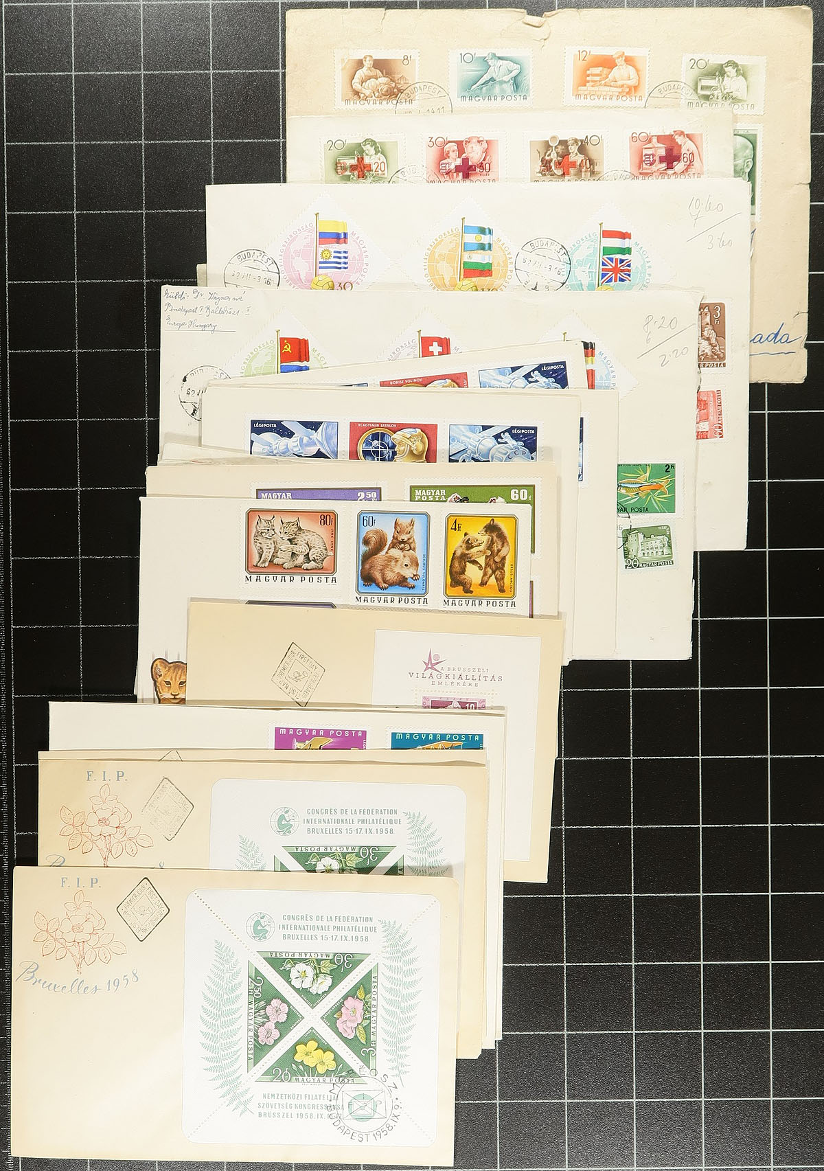 Group of roughly 160 Hungary coves, 1950's-1970s', with half being first day covers noting singles, sets, and souvenir sheet frankings (noting Scott #1202a (x2, c.v. $60 total as used stamps, along with imperforate souvenir sheet fdc c.v. $50), with the other half being maximum cards, along with a few postal stationery and first flight covers. An interesting mix with condition being mixed to very fine due to the size of the covers. A nice lot with many thematic or topical possibilities. Estimate =