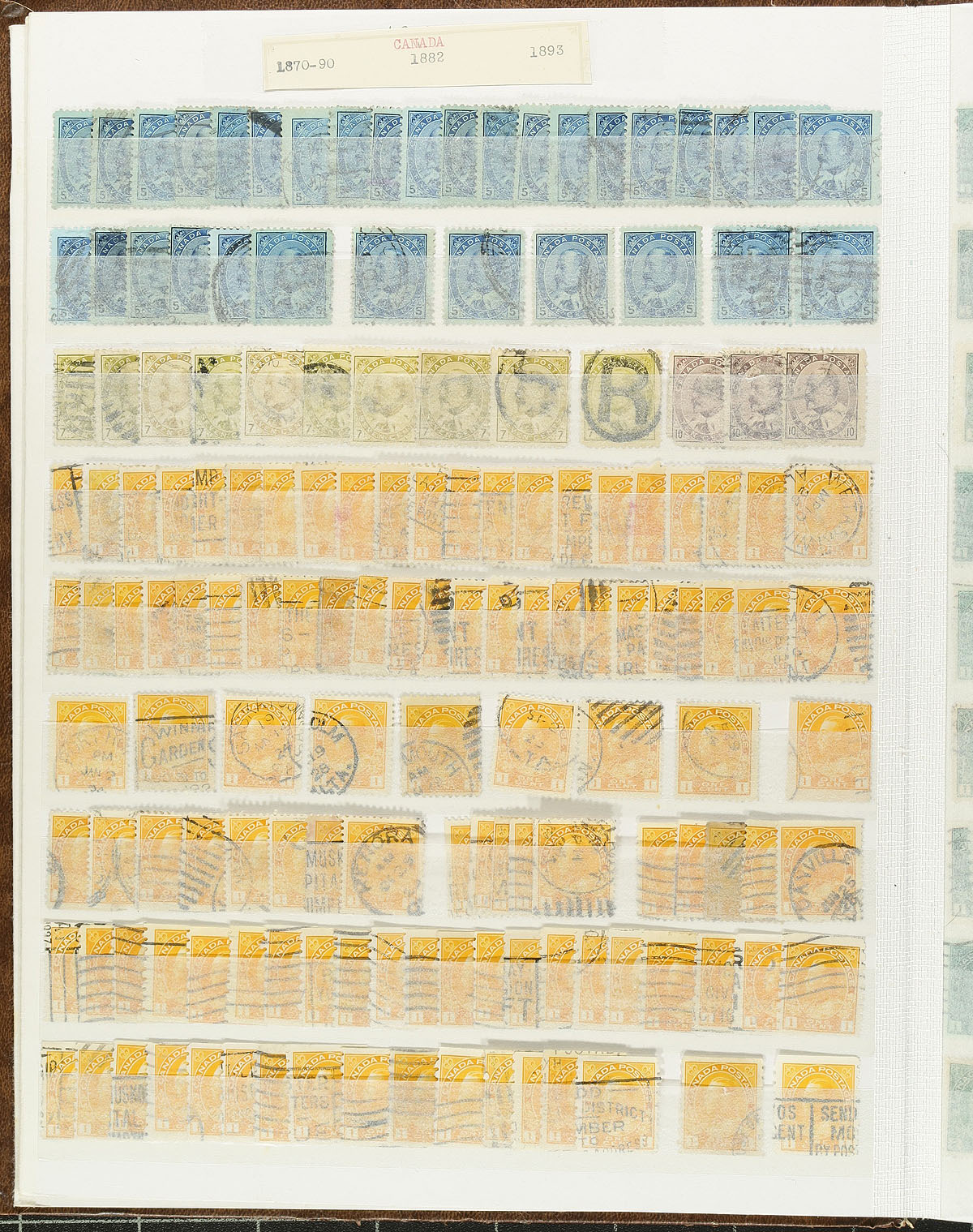 Large accumulation of used Canada, Small Queens to modern issues. The lot contains roughly 25,000 stamps in a variety of formats and is nicely organized considering the amount of material present. The lot begins with a Lighthouse stockbook containing roughly 4,000 pre-1950 issues (mainly low to medium value definitives, with plenty of postmark interest); a Lighthouse stockbook with roughly 3,000 stamps of mostly high denomination stamps from the 1960s onwards; a binder containing over 1,000 stamps of back of the book material (War Tax, revenues, special delivery, a few precancels, along with modern covers and used booklet panes, and more); and roughly 17,000 stamps neatly organized by Scott number in glassines or plastic pouches (1950's onwards). A nice potentially high cataloguing lot for the used collector as we note a good variety of cancel types including several 'socked on the nose' town postmarks. Should be well worth our low estimate of 1c per stamp. Estimate =