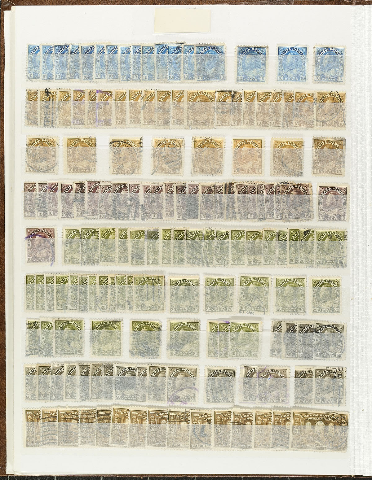 Large accumulation of used Canada, Small Queens to modern issues. The lot contains roughly 25,000 stamps in a variety of formats and is nicely organized considering the amount of material present. The lot begins with a Lighthouse stockbook containing roughly 4,000 pre-1950 issues (mainly low to medium value definitives, with plenty of postmark interest); a Lighthouse stockbook with roughly 3,000 stamps of mostly high denomination stamps from the 1960s onwards; a binder containing over 1,000 stamps of back of the book material (War Tax, revenues, special delivery, a few precancels, along with modern covers and used booklet panes, and more); and roughly 17,000 stamps neatly organized by Scott number in glassines or plastic pouches (1950's onwards). A nice potentially high cataloguing lot for the used collector as we note a good variety of cancel types including several 'socked on the nose' town postmarks. Should be well worth our low estimate of 1c per stamp. Estimate =