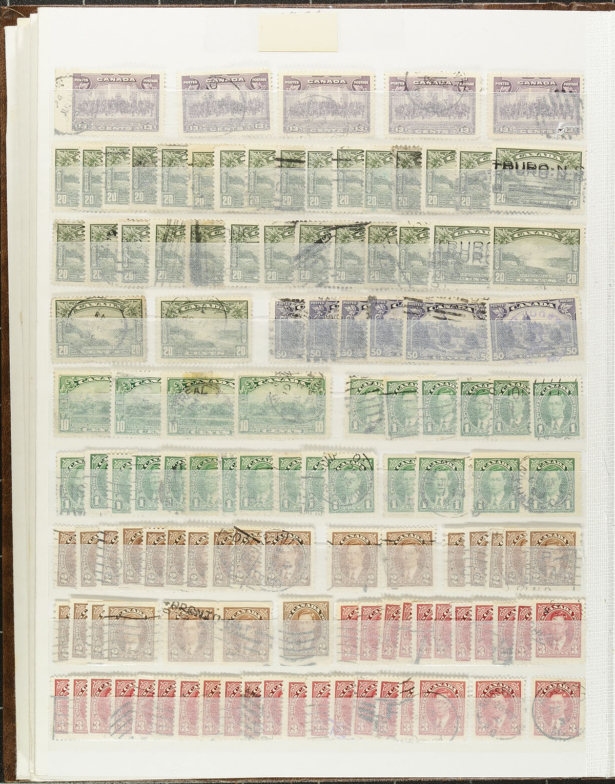 Large accumulation of used Canada, Small Queens to modern issues. The lot contains roughly 25,000 stamps in a variety of formats and is nicely organized considering the amount of material present. The lot begins with a Lighthouse stockbook containing roughly 4,000 pre-1950 issues (mainly low to medium value definitives, with plenty of postmark interest); a Lighthouse stockbook with roughly 3,000 stamps of mostly high denomination stamps from the 1960s onwards; a binder containing over 1,000 stamps of back of the book material (War Tax, revenues, special delivery, a few precancels, along with modern covers and used booklet panes, and more); and roughly 17,000 stamps neatly organized by Scott number in glassines or plastic pouches (1950's onwards). A nice potentially high cataloguing lot for the used collector as we note a good variety of cancel types including several 'socked on the nose' town postmarks. Should be well worth our low estimate of 1c per stamp. Estimate =