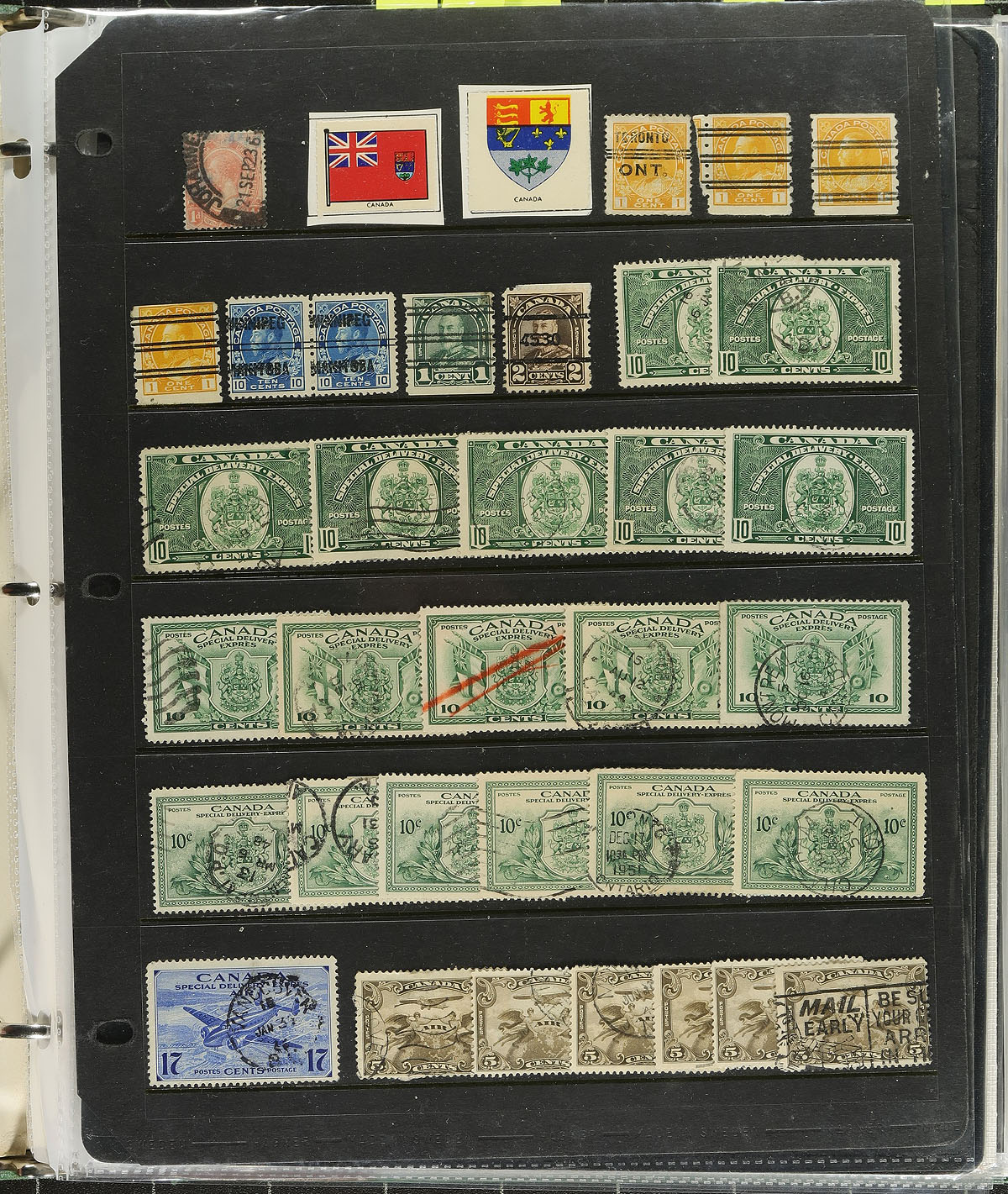 Large accumulation of used Canada, Small Queens to modern issues. The lot contains roughly 25,000 stamps in a variety of formats and is nicely organized considering the amount of material present. The lot begins with a Lighthouse stockbook containing roughly 4,000 pre-1950 issues (mainly low to medium value definitives, with plenty of postmark interest); a Lighthouse stockbook with roughly 3,000 stamps of mostly high denomination stamps from the 1960s onwards; a binder containing over 1,000 stamps of back of the book material (War Tax, revenues, special delivery, a few precancels, along with modern covers and used booklet panes, and more); and roughly 17,000 stamps neatly organized by Scott number in glassines or plastic pouches (1950's onwards). A nice potentially high cataloguing lot for the used collector as we note a good variety of cancel types including several 'socked on the nose' town postmarks. Should be well worth our low estimate of 1c per stamp. Estimate =