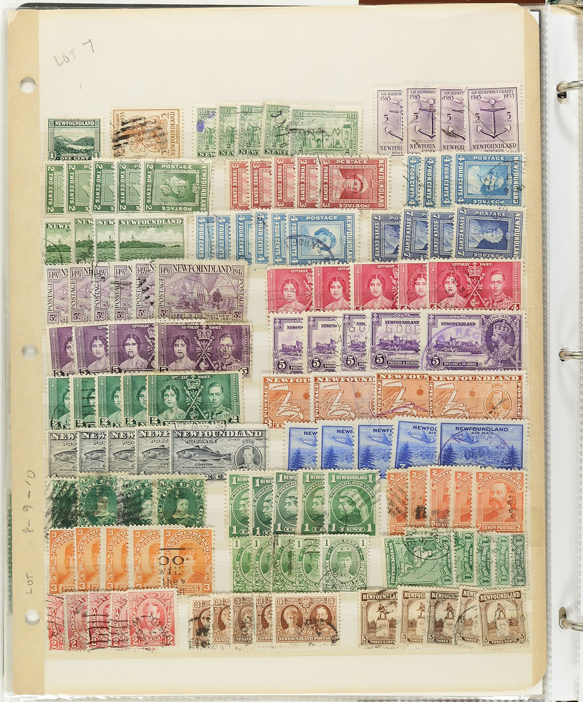 Large accumulation of used Canada, Small Queens to modern issues. The lot contains roughly 25,000 stamps in a variety of formats and is nicely organized considering the amount of material present. The lot begins with a Lighthouse stockbook containing roughly 4,000 pre-1950 issues (mainly low to medium value definitives, with plenty of postmark interest); a Lighthouse stockbook with roughly 3,000 stamps of mostly high denomination stamps from the 1960s onwards; a binder containing over 1,000 stamps of back of the book material (War Tax, revenues, special delivery, a few precancels, along with modern covers and used booklet panes, and more); and roughly 17,000 stamps neatly organized by Scott number in glassines or plastic pouches (1950's onwards). A nice potentially high cataloguing lot for the used collector as we note a good variety of cancel types including several 'socked on the nose' town postmarks. Should be well worth our low estimate of 1c per stamp. Estimate =