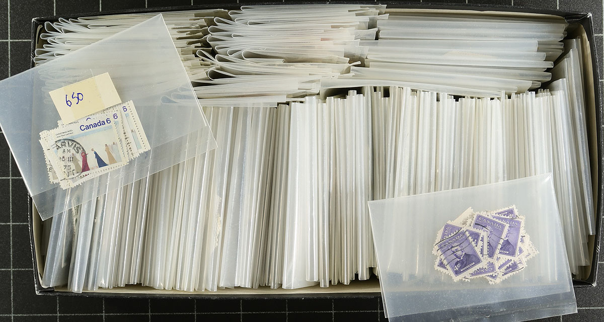 Large accumulation of used Canada, Small Queens to modern issues. The lot contains roughly 25,000 stamps in a variety of formats and is nicely organized considering the amount of material present. The lot begins with a Lighthouse stockbook containing roughly 4,000 pre-1950 issues (mainly low to medium value definitives, with plenty of postmark interest); a Lighthouse stockbook with roughly 3,000 stamps of mostly high denomination stamps from the 1960s onwards; a binder containing over 1,000 stamps of back of the book material (War Tax, revenues, special delivery, a few precancels, along with modern covers and used booklet panes, and more); and roughly 17,000 stamps neatly organized by Scott number in glassines or plastic pouches (1950's onwards). A nice potentially high cataloguing lot for the used collector as we note a good variety of cancel types including several 'socked on the nose' town postmarks. Should be well worth our low estimate of 1c per stamp. Estimate =