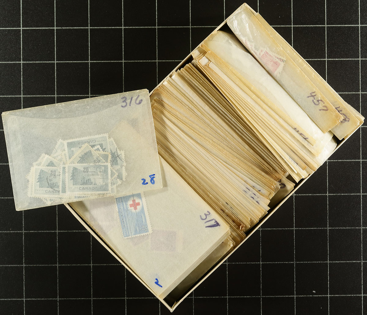 Large accumulation of used Canada, Small Queens to modern issues. The lot contains roughly 25,000 stamps in a variety of formats and is nicely organized considering the amount of material present. The lot begins with a Lighthouse stockbook containing roughly 4,000 pre-1950 issues (mainly low to medium value definitives, with plenty of postmark interest); a Lighthouse stockbook with roughly 3,000 stamps of mostly high denomination stamps from the 1960s onwards; a binder containing over 1,000 stamps of back of the book material (War Tax, revenues, special delivery, a few precancels, along with modern covers and used booklet panes, and more); and roughly 17,000 stamps neatly organized by Scott number in glassines or plastic pouches (1950's onwards). A nice potentially high cataloguing lot for the used collector as we note a good variety of cancel types including several 'socked on the nose' town postmarks. Should be well worth our low estimate of 1c per stamp. Estimate =