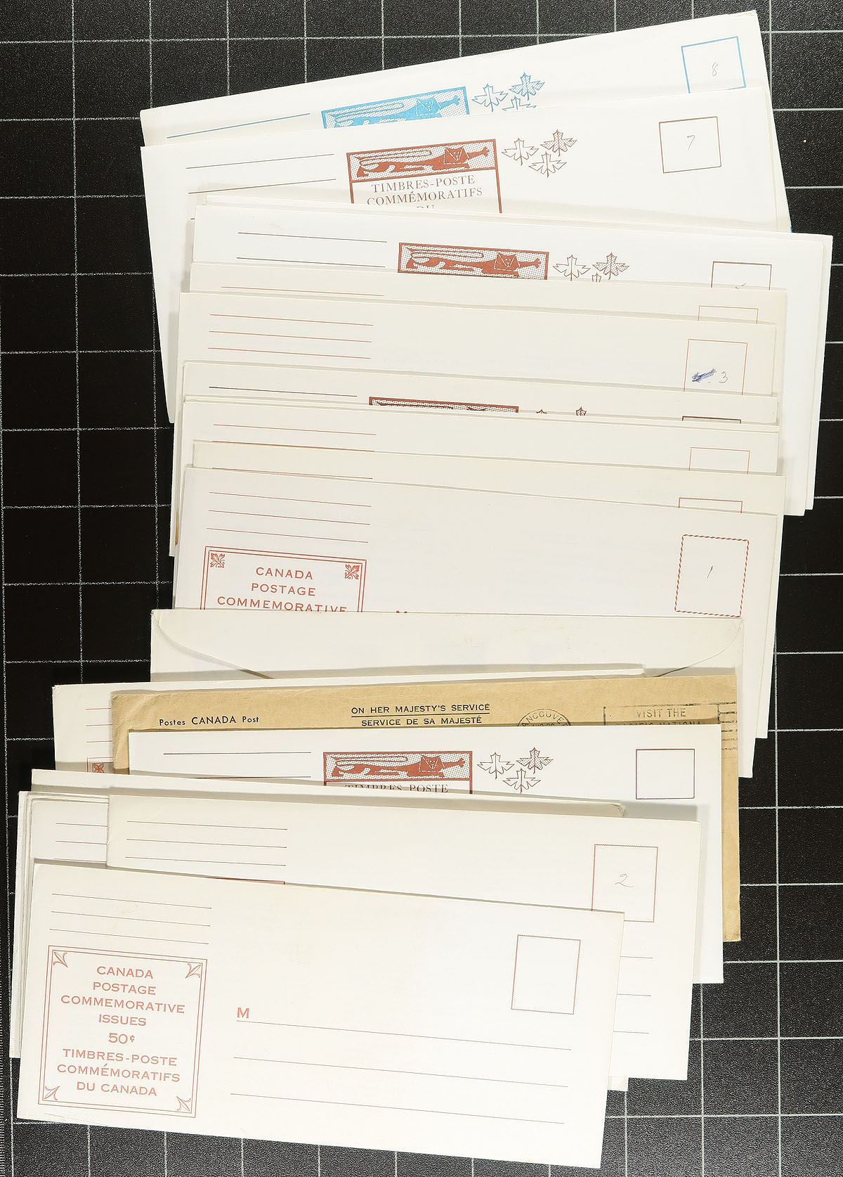 Consignment remainders of mint and used Canada containing many hundreds of stamps in a variety of formats. A cursory check indicated used material from the Small Queens onwards, with strength in mint (and never hinged), with used material from the 1950's to the 1980's, in a few albums, album pages, glassines, and more, noting singles, sets and partial sets, blocks, plate blocks, back of the book material precancels, and much more, with some items cataloguing $10 and up including a used 50c Bluenose, Unitrade #522i centre block of 4 (x2, nh, c.v. $80 total), 525i centre block of 4 (x3, nh, $120 total). A good lot with potential finds for the dedicated collector, overall fine to very fine. Estimate =