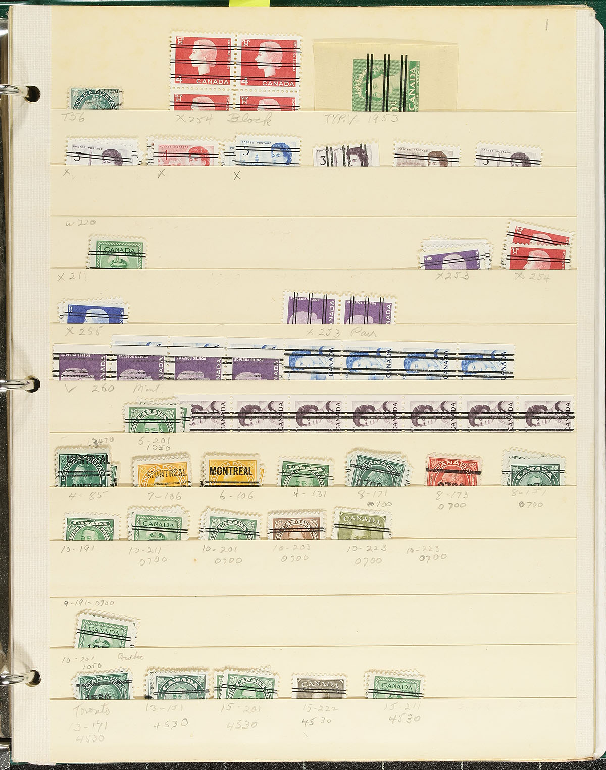 Consignment remainders of mint and used Canada containing many hundreds of stamps in a variety of formats. A cursory check indicated used material from the Small Queens onwards, with strength in mint (and never hinged), with used material from the 1950's to the 1980's, in a few albums, album pages, glassines, and more, noting singles, sets and partial sets, blocks, plate blocks, back of the book material precancels, and much more, with some items cataloguing $10 and up including a used 50c Bluenose, Unitrade #522i centre block of 4 (x2, nh, c.v. $80 total), 525i centre block of 4 (x3, nh, $120 total). A good lot with potential finds for the dedicated collector, overall fine to very fine. Estimate =