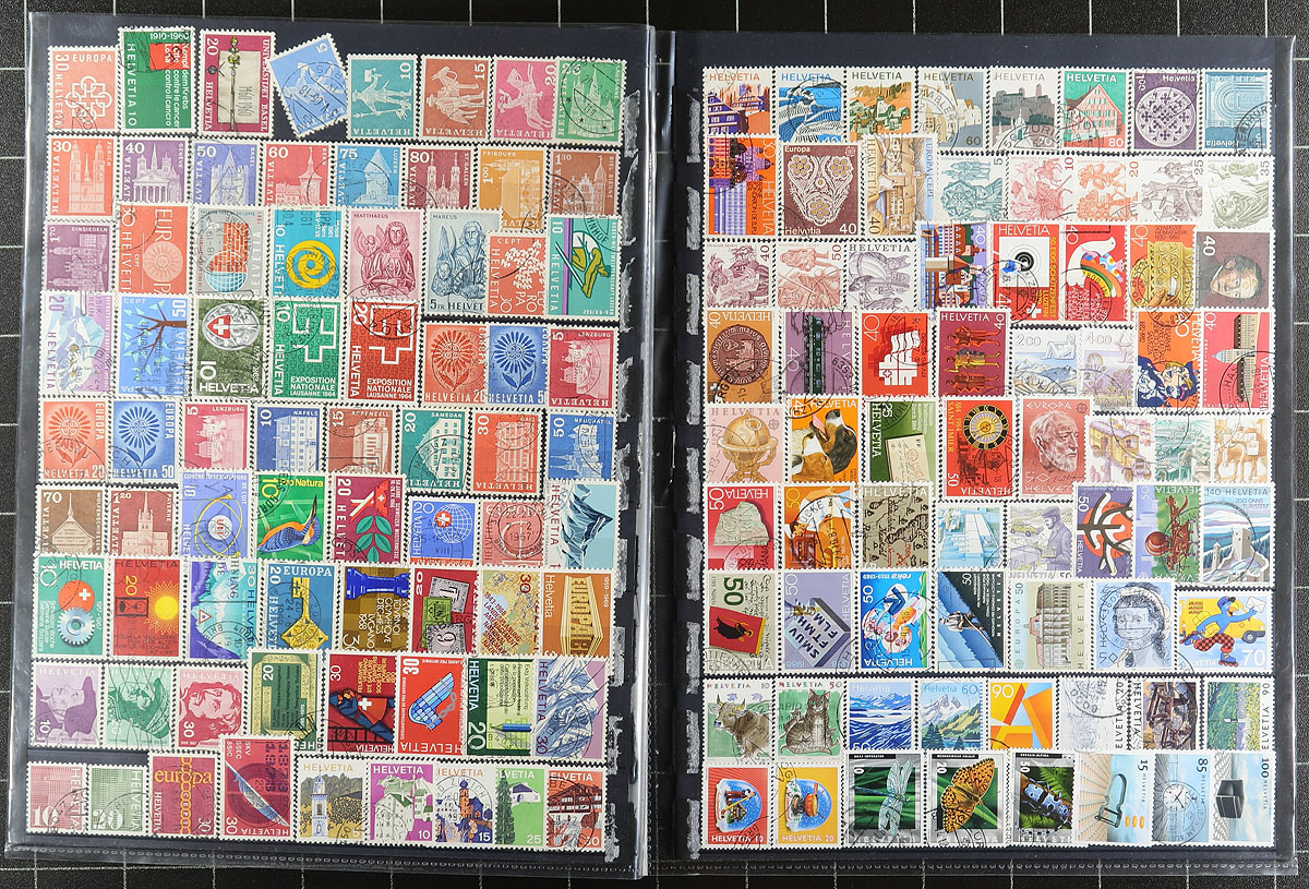 Collection / accumulation of used Switzerland, 1862-2007, containing over 1,500 stamps in several stock pags and two albums. The lot generally ranges from Scott #43/1274, including semi-postals and other bacak of the book issues, with a spot check indicating a few items cataloging $10 and up. Owner's 2013 Scott catalogue value for the lot totals US$1,091.00, with mild duplication throughout. A nice lot from this popular collecting country, a few small faults with a few of the early issues, overall fine to very fine. Estimate =
