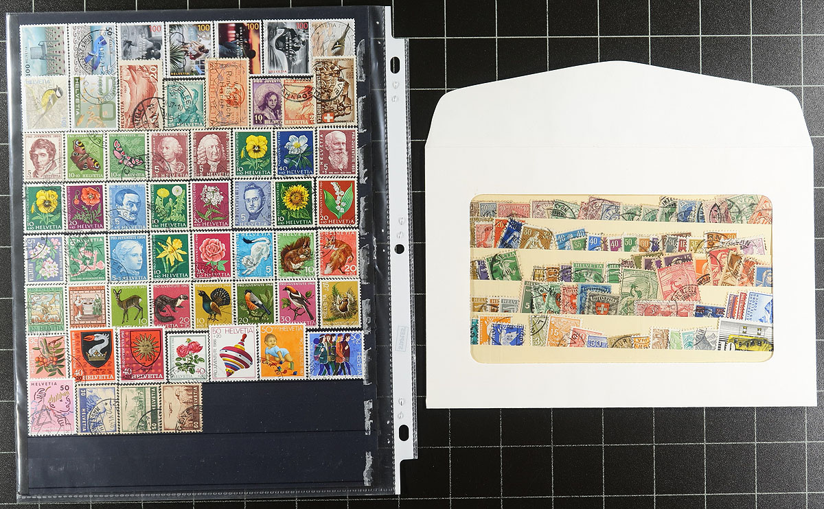 Collection / accumulation of used Switzerland, 1862-2007, containing over 1,500 stamps in several stock pags and two albums. The lot generally ranges from Scott #43/1274, including semi-postals and other bacak of the book issues, with a spot check indicating a few items cataloging $10 and up. Owner's 2013 Scott catalogue value for the lot totals US$1,091.00, with mild duplication throughout. A nice lot from this popular collecting country, a few small faults with a few of the early issues, overall fine to very fine. Estimate =