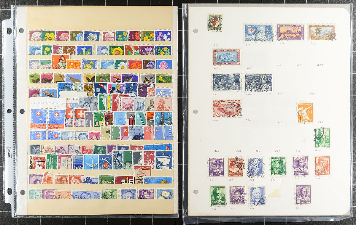 Collection / accumulation of used Switzerland, 1862-2007, containing over 1,500 stamps in several stock pags and two albums. The lot generally ranges from Scott #43/1274, including semi-postals and other bacak of the book issues, with a spot check indicating a few items cataloging $10 and up. Owner's 2013 Scott catalogue value for the lot totals US$1,091.00, with mild duplication throughout. A nice lot from this popular collecting country, a few small faults with a few of the early issues, overall fine to very fine. Estimate =