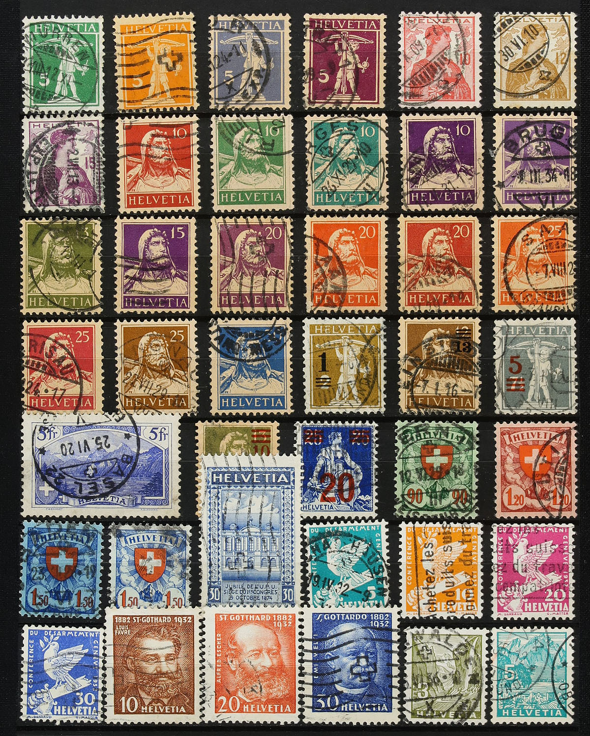 Collection / accumulation of used Switzerland, 1862-2007, containing over 1,500 stamps in several stock pags and two albums. The lot generally ranges from Scott #43/1274, including semi-postals and other bacak of the book issues, with a spot check indicating a few items cataloging $10 and up. Owner's 2013 Scott catalogue value for the lot totals US$1,091.00, with mild duplication throughout. A nice lot from this popular collecting country, a few small faults with a few of the early issues, overall fine to very fine. Estimate =