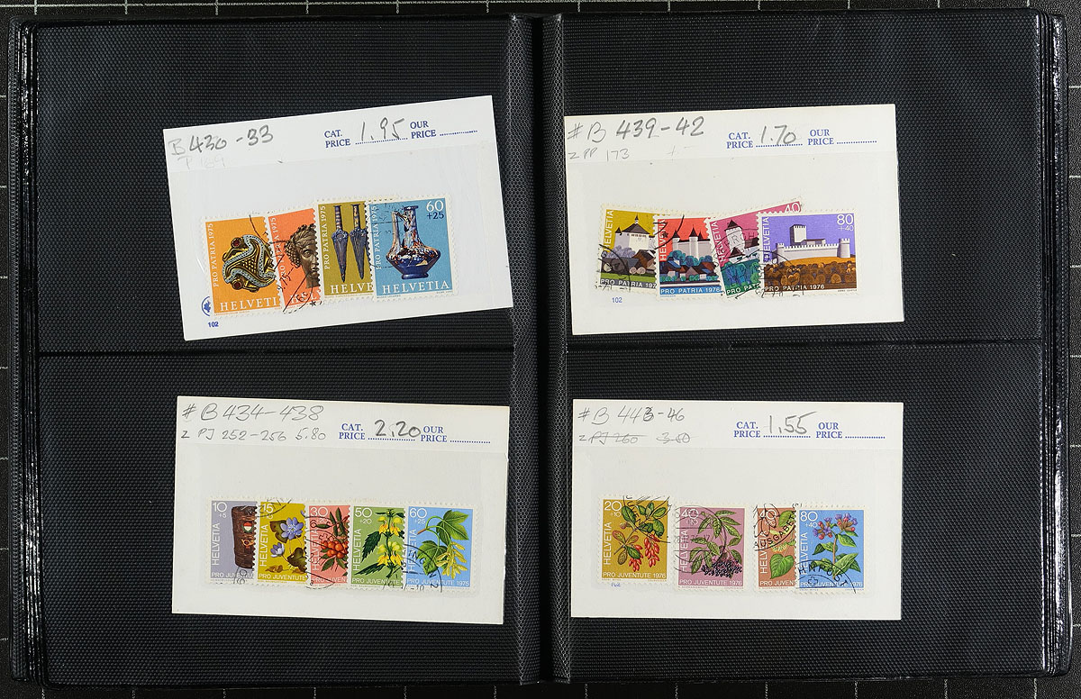 Collection / accumulation of used Switzerland, 1862-2007, containing over 1,500 stamps in several stock pags and two albums. The lot generally ranges from Scott #43/1274, including semi-postals and other bacak of the book issues, with a spot check indicating a few items cataloging $10 and up. Owner's 2013 Scott catalogue value for the lot totals US$1,091.00, with mild duplication throughout. A nice lot from this popular collecting country, a few small faults with a few of the early issues, overall fine to very fine. Estimate =