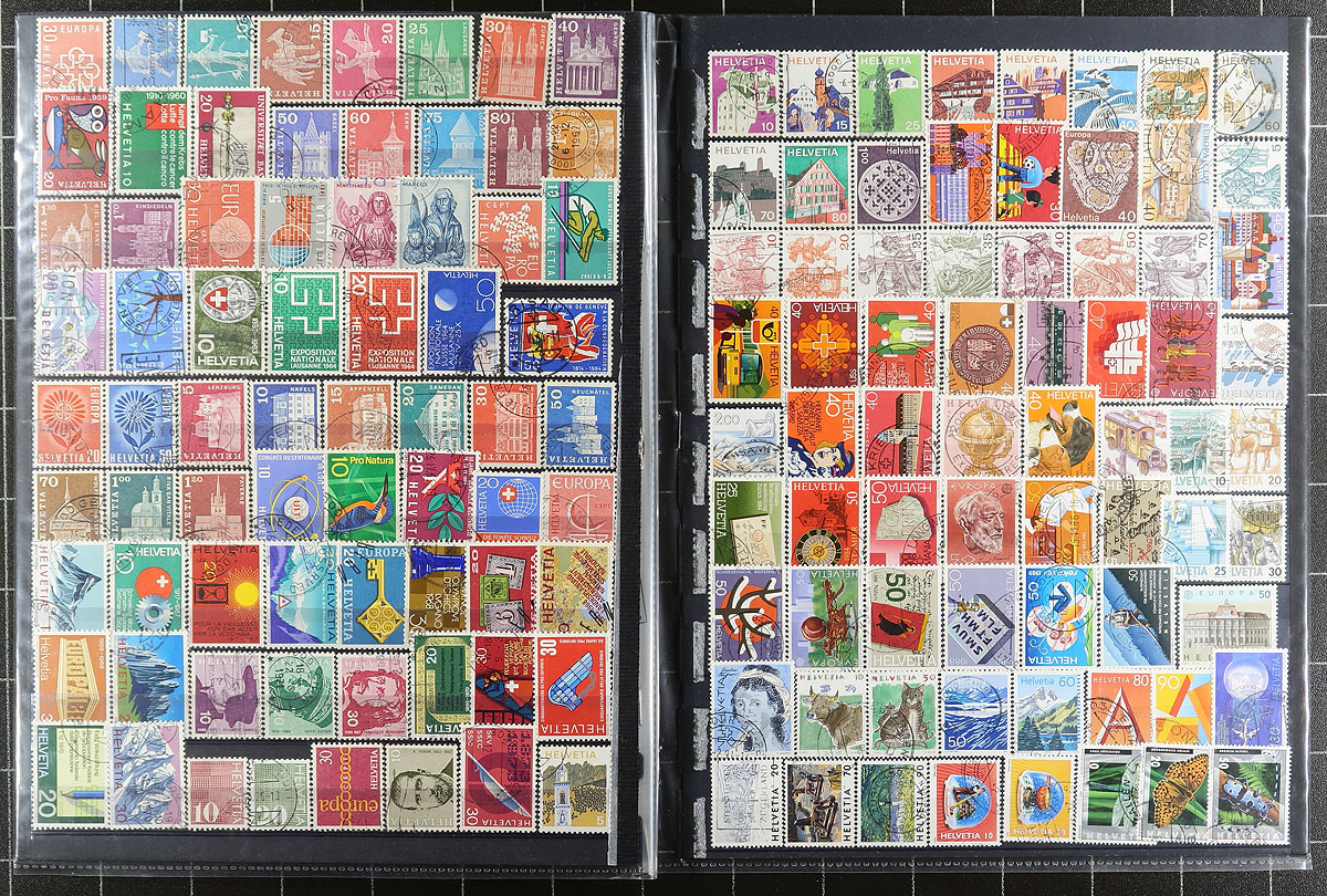 Collection / accumulation of used Switzerland, 1862-2007, containing over 1,500 stamps in several stock pags and two albums. The lot generally ranges from Scott #43/1274, including semi-postals and other bacak of the book issues, with a spot check indicating a few items cataloging $10 and up. Owner's 2013 Scott catalogue value for the lot totals US$1,091.00, with mild duplication throughout. A nice lot from this popular collecting country, a few small faults with a few of the early issues, overall fine to very fine. Estimate =
