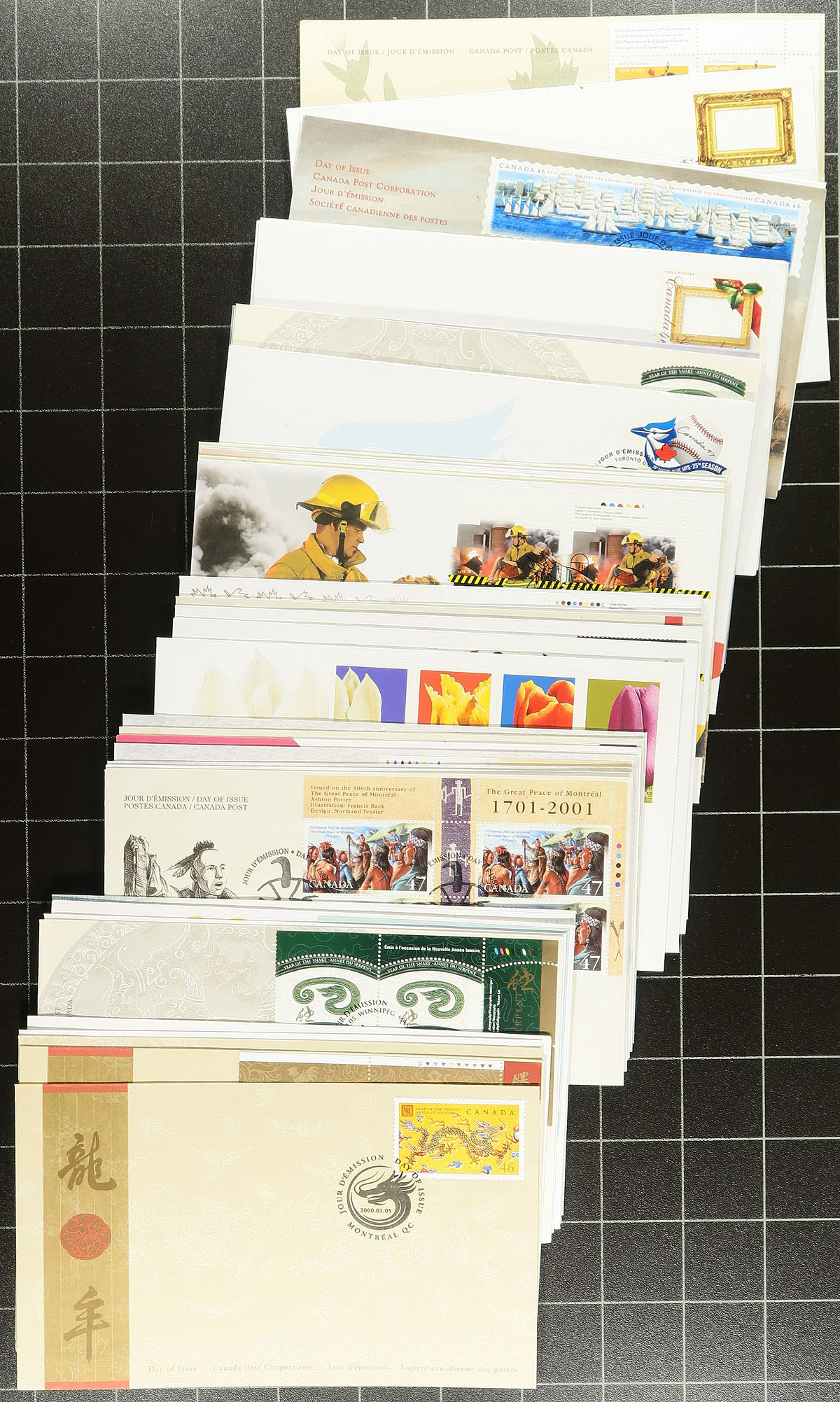 First Day Covers. Collection / accumulation of modern first day covers, 2000-2007, containing a few hundred covers with singles, sets, plate blocks, and souvenir sheet frankings. The lot includes a complete set of covers from 2005 and 2007 in wooden boxes from Canada Post (original retail price for both totals $117.90). A nice lot for collectors and dealers alike with duplication possible for some issues, overall fine to very fine. Estimate =