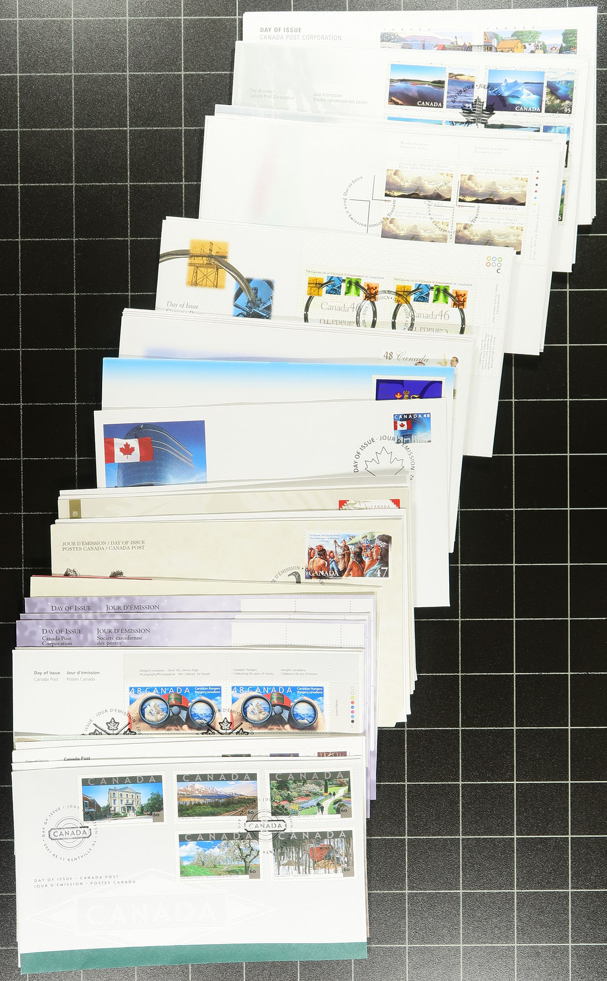 First Day Covers. Collection / accumulation of modern first day covers, 2000-2007, containing a few hundred covers with singles, sets, plate blocks, and souvenir sheet frankings. The lot includes a complete set of covers from 2005 and 2007 in wooden boxes from Canada Post (original retail price for both totals $117.90). A nice lot for collectors and dealers alike with duplication possible for some issues, overall fine to very fine. Estimate =