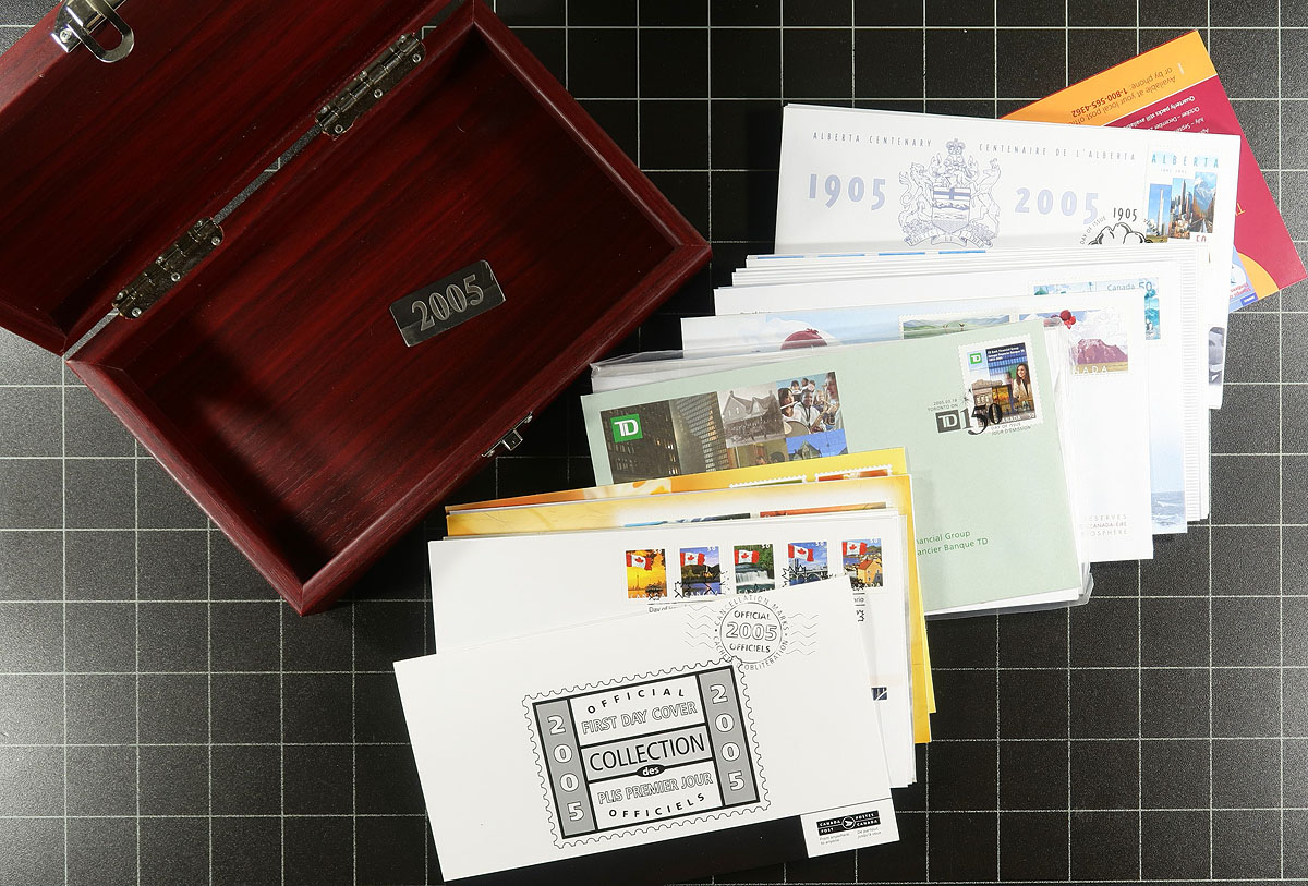 First Day Covers. Collection / accumulation of modern first day covers, 2000-2007, containing a few hundred covers with singles, sets, plate blocks, and souvenir sheet frankings. The lot includes a complete set of covers from 2005 and 2007 in wooden boxes from Canada Post (original retail price for both totals $117.90). A nice lot for collectors and dealers alike with duplication possible for some issues, overall fine to very fine. Estimate =