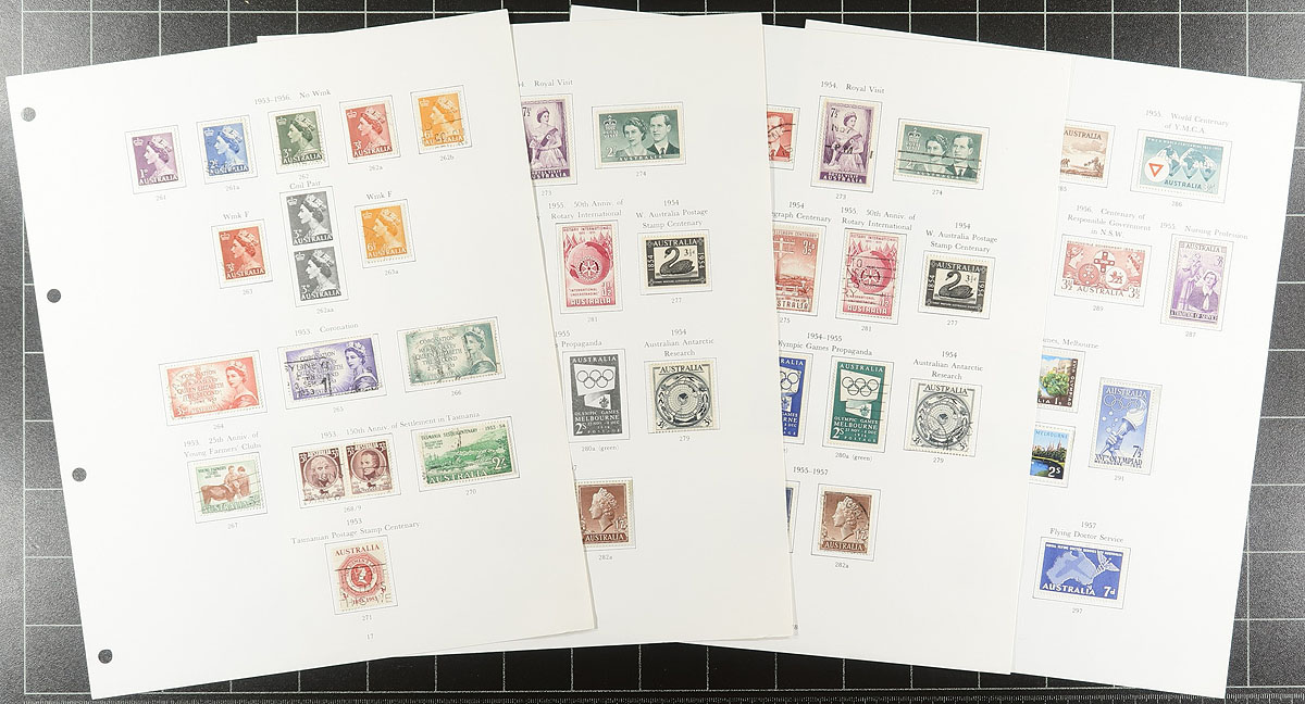 Collection / accumulation of primarily used Australia, 1913-1990's, containing over 1,500 stamps in several album or stock pages, and a stock book. The lot generally ranges from Scott #1/1235, including a small selection of Kangaroos, King George V Heads, Australian States and back of the book issues. A spot check indicates some items cataloguing $10 and up, with owner's 2013 Scott catalogue value for the lot totaling US$1,442.00 ($1946.70 CDN), leaving better finds to the dedicated collector, including two stock pages of town cancel types. A nice lot for the Australia collector, overall fine to very fine. Estimate =