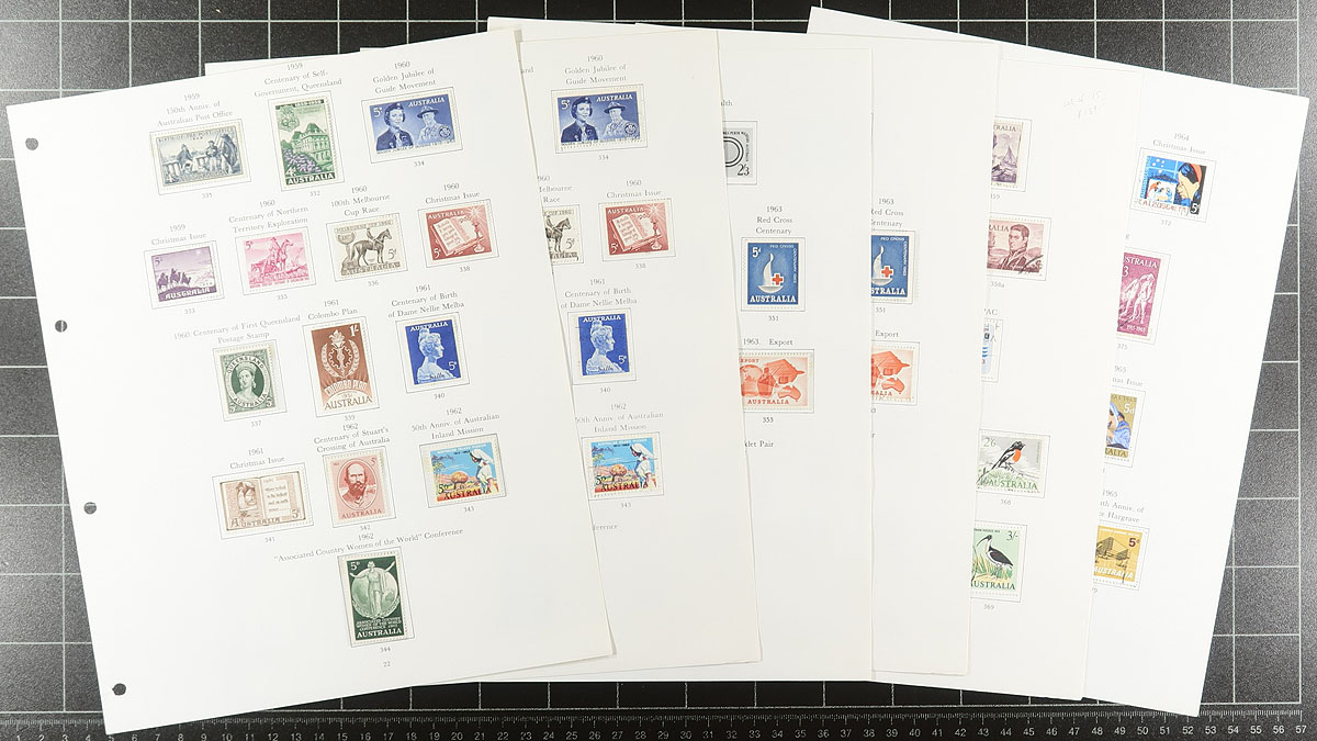 Collection / accumulation of primarily used Australia, 1913-1990's, containing over 1,500 stamps in several album or stock pages, and a stock book. The lot generally ranges from Scott #1/1235, including a small selection of Kangaroos, King George V Heads, Australian States and back of the book issues. A spot check indicates some items cataloguing $10 and up, with owner's 2013 Scott catalogue value for the lot totaling US$1,442.00 ($1946.70 CDN), leaving better finds to the dedicated collector, including two stock pages of town cancel types. A nice lot for the Australia collector, overall fine to very fine. Estimate =