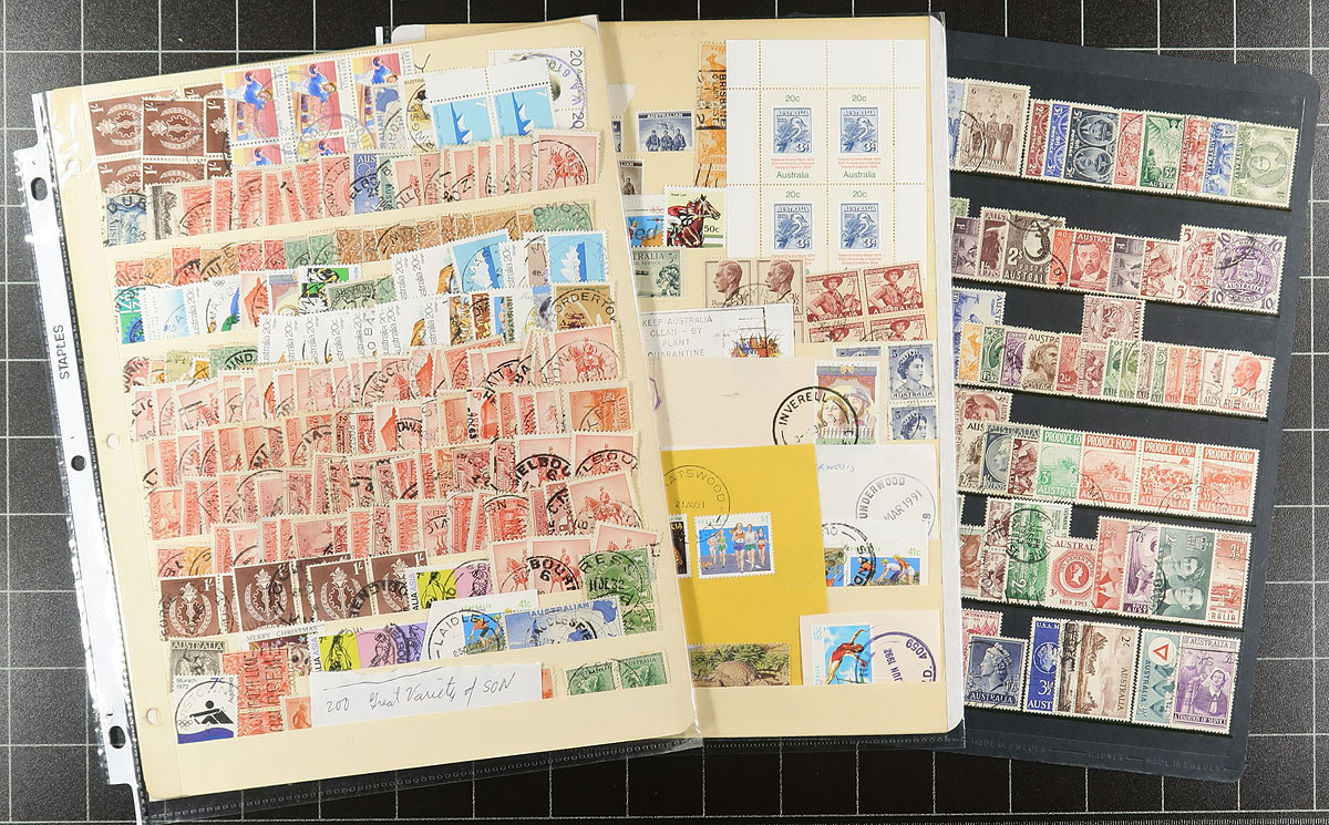 Collection / accumulation of primarily used Australia, 1913-1990's, containing over 1,500 stamps in several album or stock pages, and a stock book. The lot generally ranges from Scott #1/1235, including a small selection of Kangaroos, King George V Heads, Australian States and back of the book issues. A spot check indicates some items cataloguing $10 and up, with owner's 2013 Scott catalogue value for the lot totaling US$1,442.00 ($1946.70 CDN), leaving better finds to the dedicated collector, including two stock pages of town cancel types. A nice lot for the Australia collector, overall fine to very fine. Estimate =