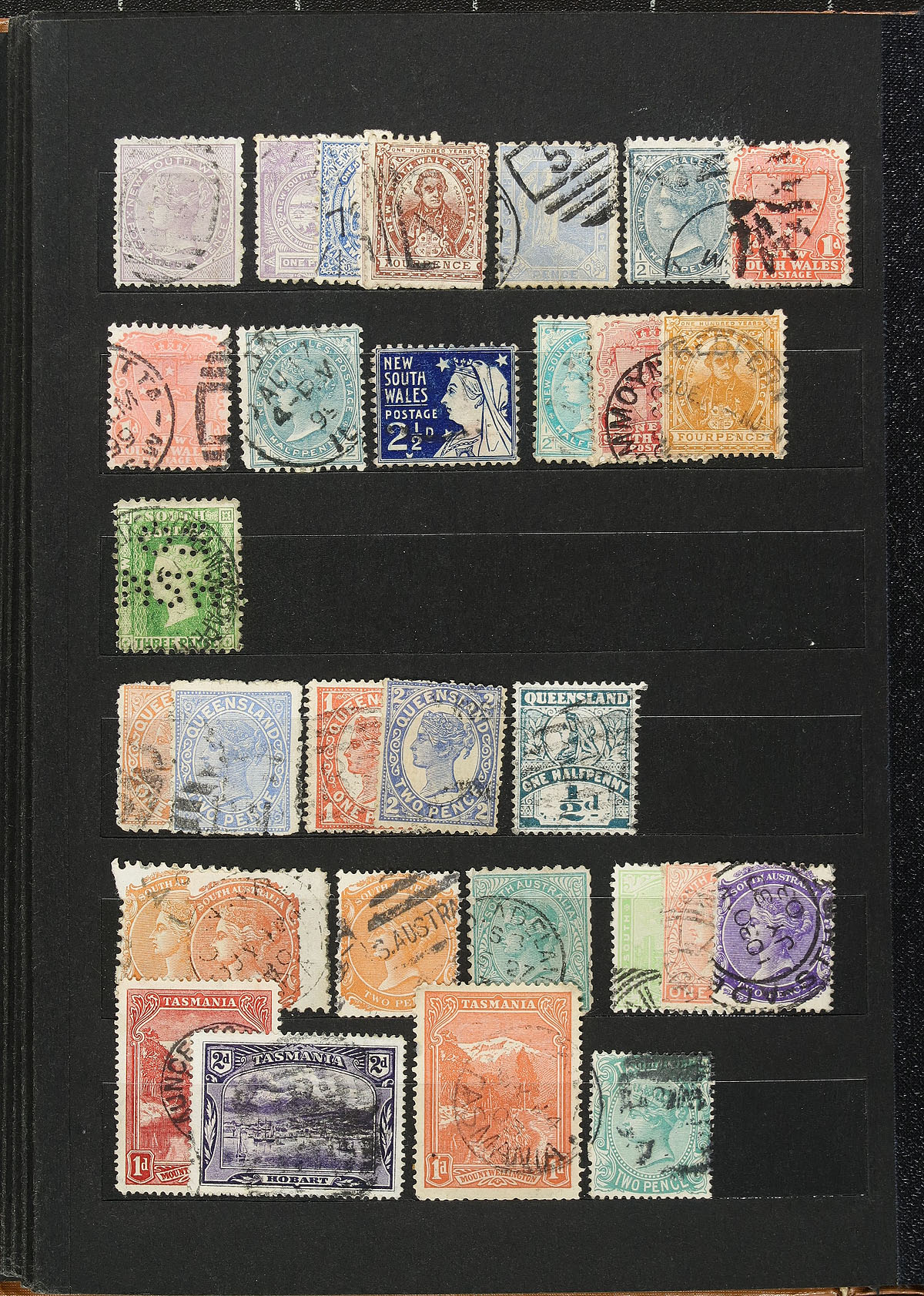 Collection / accumulation of primarily used Australia, 1913-1990's, containing over 1,500 stamps in several album or stock pages, and a stock book. The lot generally ranges from Scott #1/1235, including a small selection of Kangaroos, King George V Heads, Australian States and back of the book issues. A spot check indicates some items cataloguing $10 and up, with owner's 2013 Scott catalogue value for the lot totaling US$1,442.00 ($1946.70 CDN), leaving better finds to the dedicated collector, including two stock pages of town cancel types. A nice lot for the Australia collector, overall fine to very fine. Estimate =