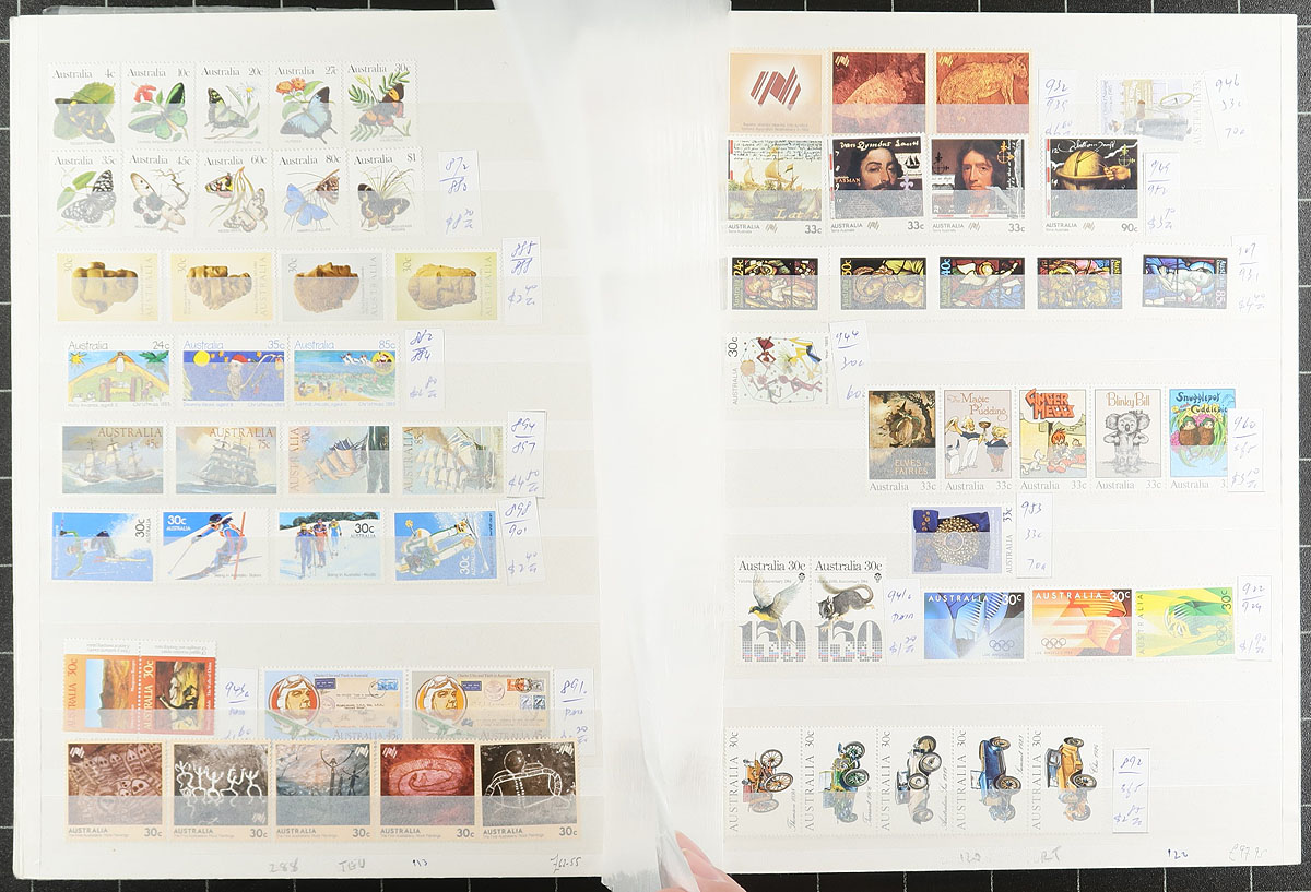 Accumulation of primarily never hinged Australia, 1960's-2001, containing many hundreds of stamps in stock or album pages, several glassines and presentation packs. The lot generally ranges from Scott #388/1954, including sets, blocks, and more. A spot check indicated roughly 40 presentation packs, primarily from the 1980's to the 1990's, with some items cataloguing $10 and up, with face value alone estimated to be in the $300.00 range. A nice lot for the Australia collector or postage user, overall fine to very fine. Estimate =