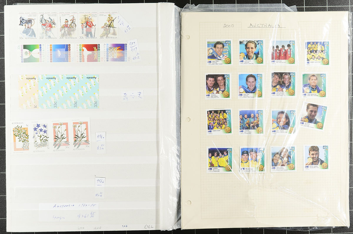 Accumulation of primarily never hinged Australia, 1960's-2001, containing many hundreds of stamps in stock or album pages, several glassines and presentation packs. The lot generally ranges from Scott #388/1954, including sets, blocks, and more. A spot check indicated roughly 40 presentation packs, primarily from the 1980's to the 1990's, with some items cataloguing $10 and up, with face value alone estimated to be in the $300.00 range. A nice lot for the Australia collector or postage user, overall fine to very fine. Estimate =