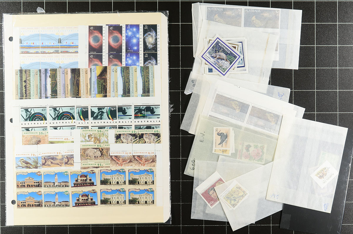 Accumulation of primarily never hinged Australia, 1960's-2001, containing many hundreds of stamps in stock or album pages, several glassines and presentation packs. The lot generally ranges from Scott #388/1954, including sets, blocks, and more. A spot check indicated roughly 40 presentation packs, primarily from the 1980's to the 1990's, with some items cataloguing $10 and up, with face value alone estimated to be in the $300.00 range. A nice lot for the Australia collector or postage user, overall fine to very fine. Estimate =