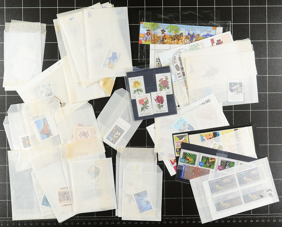 Accumulation of primarily never hinged Australia, 1960's-2001, containing many hundreds of stamps in stock or album pages, several glassines and presentation packs. The lot generally ranges from Scott #388/1954, including sets, blocks, and more. A spot check indicated roughly 40 presentation packs, primarily from the 1980's to the 1990's, with some items cataloguing $10 and up, with face value alone estimated to be in the $300.00 range. A nice lot for the Australia collector or postage user, overall fine to very fine. Estimate =