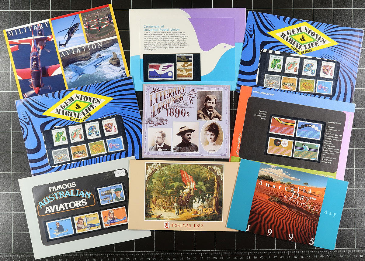 Accumulation of primarily never hinged Australia, 1960's-2001, containing many hundreds of stamps in stock or album pages, several glassines and presentation packs. The lot generally ranges from Scott #388/1954, including sets, blocks, and more. A spot check indicated roughly 40 presentation packs, primarily from the 1980's to the 1990's, with some items cataloguing $10 and up, with face value alone estimated to be in the $300.00 range. A nice lot for the Australia collector or postage user, overall fine to very fine. Estimate =