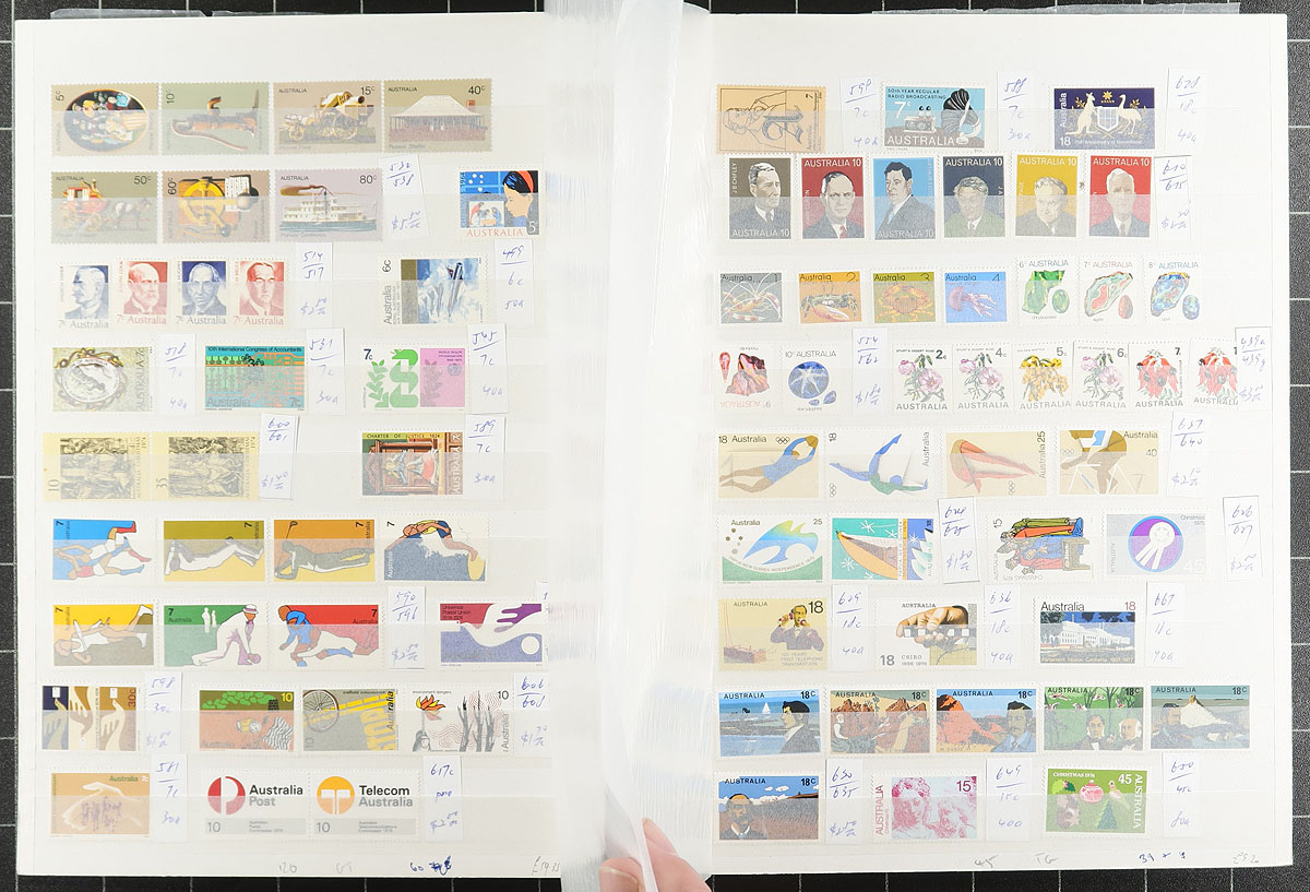 Accumulation of primarily never hinged Australia, 1960's-2001, containing many hundreds of stamps in stock or album pages, several glassines and presentation packs. The lot generally ranges from Scott #388/1954, including sets, blocks, and more. A spot check indicated roughly 40 presentation packs, primarily from the 1980's to the 1990's, with some items cataloguing $10 and up, with face value alone estimated to be in the $300.00 range. A nice lot for the Australia collector or postage user, overall fine to very fine. Estimate =
