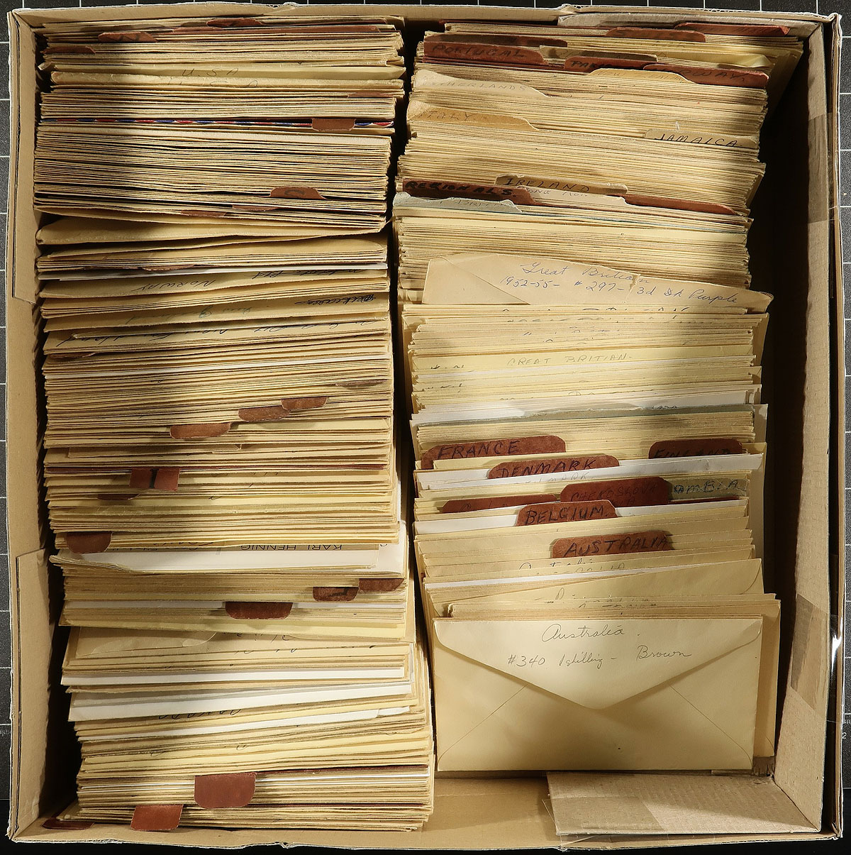 Accumulation of primarily used worldwide stamps in a few hundred well described envelopes. The lot contains probably over 1,000 stamps, ranging from A to Z countries, with each envelope identifying each country along with perfins, christmas seals, pairs, etc. We note better representation from Canada, China, European countries and more, with material generally ranging from the 1900's to the 1960's. A spot check indicated a few items cataloguing $5 to $10 each, leaving better finds to the worldwide collector. A nice lot that has not seen the light of day for many years, overall fine to very fine. Estimate =