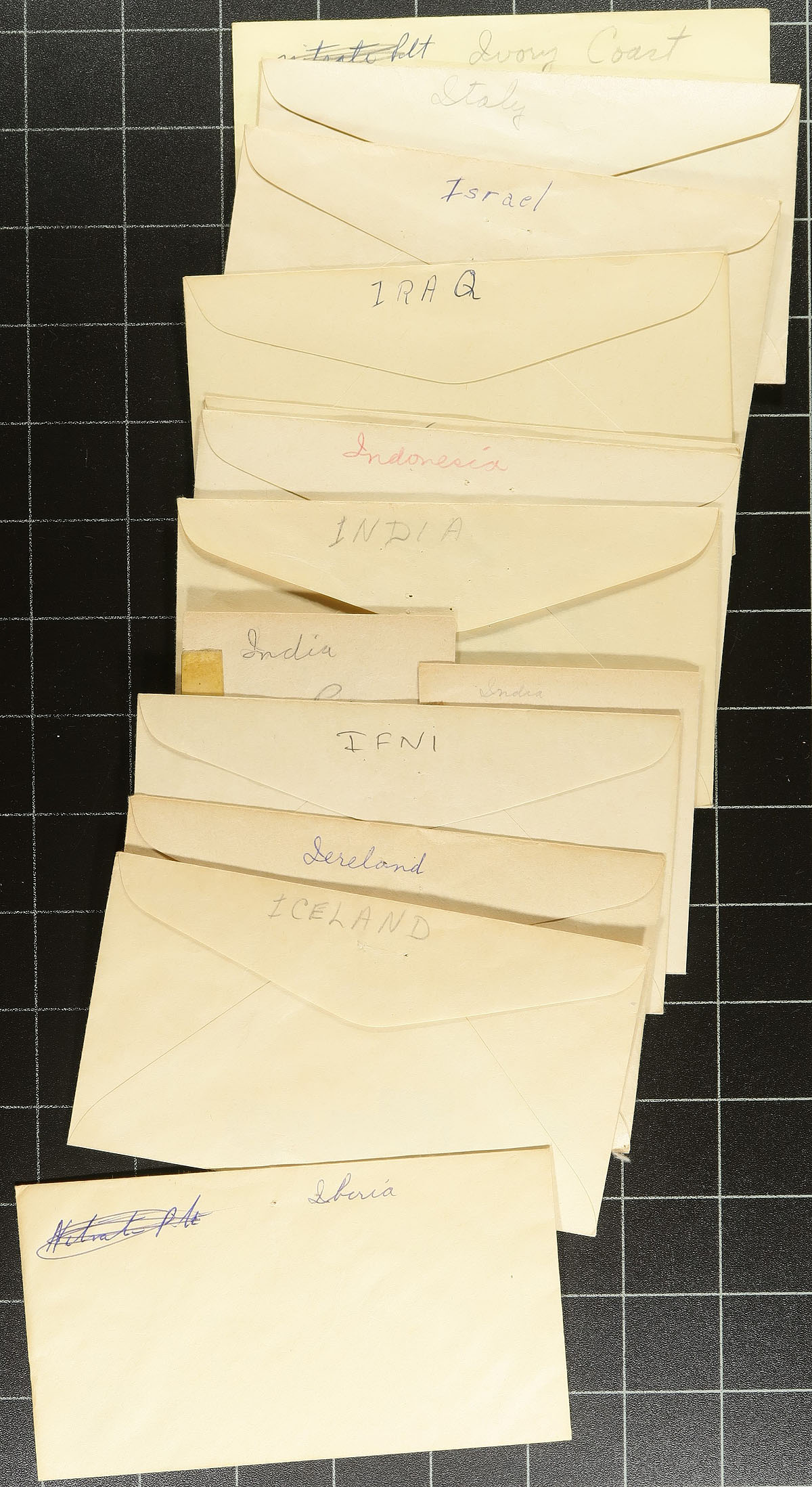 Accumulation of primarily used worldwide stamps in a few hundred well described envelopes. The lot contains probably over 1,000 stamps, ranging from A to Z countries, with each envelope identifying each country along with perfins, christmas seals, pairs, etc. We note better representation from Canada, China, European countries and more, with material generally ranging from the 1900's to the 1960's. A spot check indicated a few items cataloguing $5 to $10 each, leaving better finds to the worldwide collector. A nice lot that has not seen the light of day for many years, overall fine to very fine. Estimate =