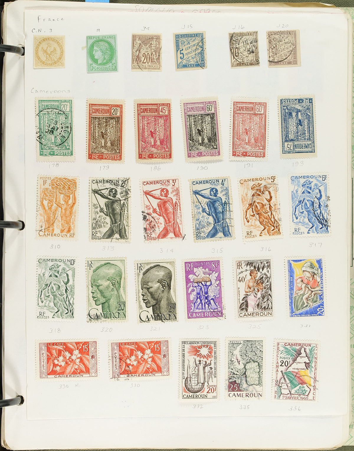 Collection of worldwide used stamps on a few hundred homemade pages. The collection is well organized ranging from A to W countries, noting better representation from Canada (including back of the book issues, Officials in particular), France, Germany, and other European countries, with smaller representation from other regions. A spot check indicated a few singles and partial sets cataloguing in the $5 to $10 range, leaving better finds to the dedicated collector, including better postmark types and 'socked on the nose' town cancles. Online photos show a sampling, overall fine to very fine. Estimate =