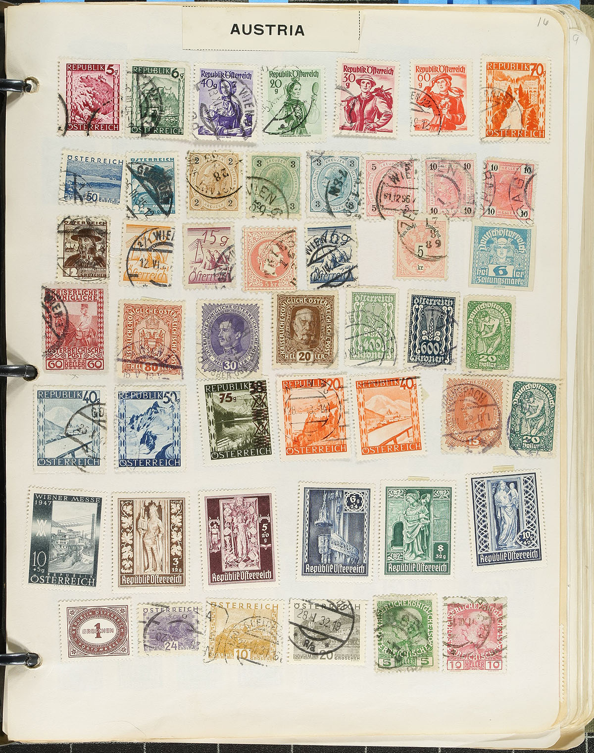 Collection of worldwide used stamps on a few hundred homemade pages. The collection is well organized ranging from A to W countries, noting better representation from Canada (including back of the book issues, Officials in particular), France, Germany, and other European countries, with smaller representation from other regions. A spot check indicated a few singles and partial sets cataloguing in the $5 to $10 range, leaving better finds to the dedicated collector, including better postmark types and 'socked on the nose' town cancles. Online photos show a sampling, overall fine to very fine. Estimate =