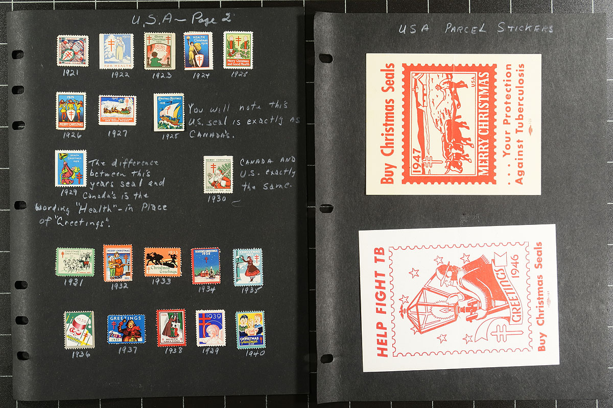 Cinderellas / Christmas Seals. Nice collection of worldwide Christmas Seals, containing many hundreds of seals in several pages housed in a binder. The collection includes mint singles from Canada ranging from 1928-1968 (including a few French language examples), United States seals ranging from 1909/1945 (including a few parcel stickers), roughly 40 Denmark complete sheets from 1950 to the 1960's, typically with a perforated and imperforate example for most years, along with a few progressive proof sheets from 1967, and a few more worldwide seals. A nice lot for the thematic, topical, or Christmas seal collector, overall fine to very fine. Estimate =