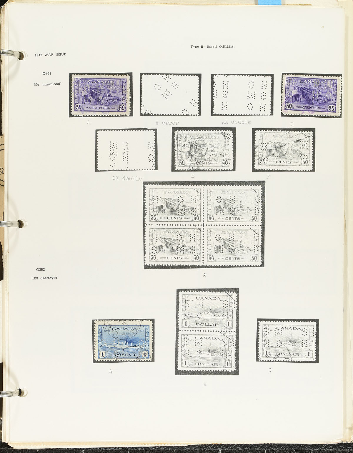 Collection of primarily used Officials and other "back of the book" issues, containing a few hundred items on homemade or Wrigley album pages. The collection is better than your average starter collection as we note a few better items including perforated 5-hole officials with Unitrade #s O8-118 (used, $30), O8-234-235, O8-242 (used, $35), and Officially Sealed OX1 (used, $100, counted as fine), along with 4-hole 50c Munitions (x2), $1 Destroyer, and 50c Lumbering (x2). The collection also includes G overprint Officials, a few revenues, and other back of the book items, with a few cataloguing $5 and up each. A nice collection that should be continued, overall fine to very fine. Estimate =