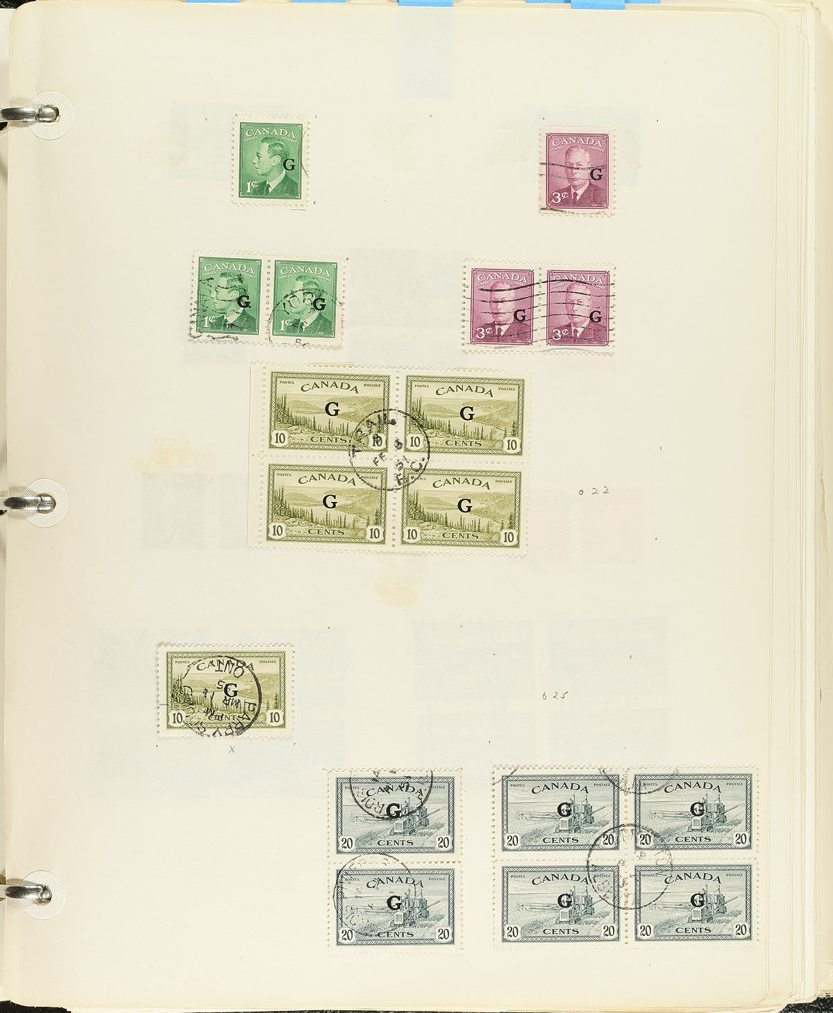 Collection of primarily used Officials and other "back of the book" issues, containing a few hundred items on homemade or Wrigley album pages. The collection is better than your average starter collection as we note a few better items including perforated 5-hole officials with Unitrade #s O8-118 (used, $30), O8-234-235, O8-242 (used, $35), and Officially Sealed OX1 (used, $100, counted as fine), along with 4-hole 50c Munitions (x2), $1 Destroyer, and 50c Lumbering (x2). The collection also includes G overprint Officials, a few revenues, and other back of the book items, with a few cataloguing $5 and up each. A nice collection that should be continued, overall fine to very fine. Estimate =
