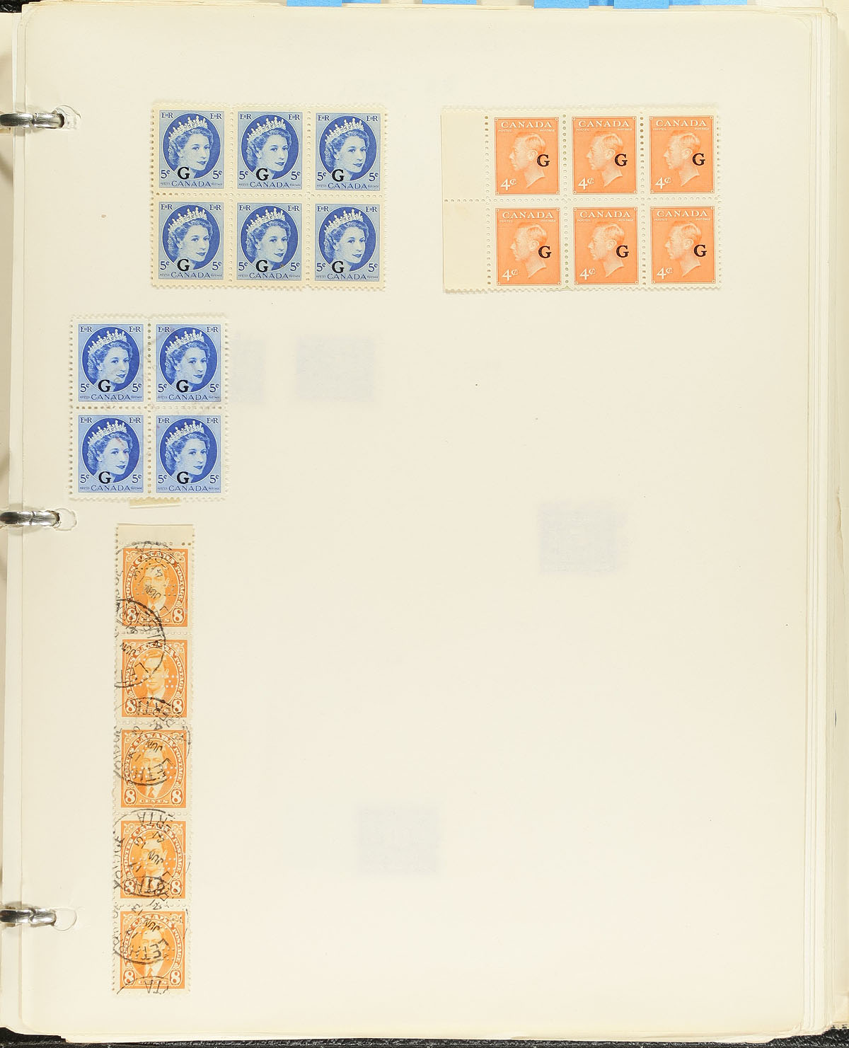 Collection of primarily used Officials and other "back of the book" issues, containing a few hundred items on homemade or Wrigley album pages. The collection is better than your average starter collection as we note a few better items including perforated 5-hole officials with Unitrade #s O8-118 (used, $30), O8-234-235, O8-242 (used, $35), and Officially Sealed OX1 (used, $100, counted as fine), along with 4-hole 50c Munitions (x2), $1 Destroyer, and 50c Lumbering (x2). The collection also includes G overprint Officials, a few revenues, and other back of the book items, with a few cataloguing $5 and up each. A nice collection that should be continued, overall fine to very fine. Estimate =