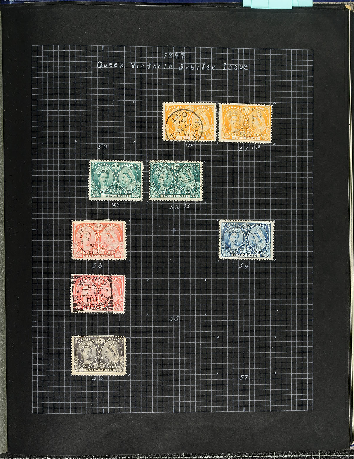 Lovely mint and used collection of Canada, 1859-1971, containing many hundreds of stamps on quadrille pages housed in two springback albums. This well organized collection ranges from Scott #14/557, beginning with used material from 1859 to 1950, and then transitions to mint and a used example for almost every issue up to 1971. Just some of the better material includes #s 14, 15 (x6), 18-19, 21-22, 24, 25 (x2), 30, along with 64 Small Queens including 10c (x3), 20c and 50c Widow Weeds, a selection of Jubilees including 20c and 50c issues, and continues with sets and partial sets of Leafs, Numerals, Edwards, Quebecs, Admirals, Scrolls, up to the Peace issues, including coils and back of the book issues. The collection post 1950 includes mint and used material including an attempt to have mint and used mini-panes, booklet panes, Christmas centre blocks of 4, tagged issues, and much more. Postmark interest includes cds, squared circles, duplex, and more. A lovely collection with a potentially high catalogue value, a few small faults with a few of the stamps, overall fine to very fine. Estimate =