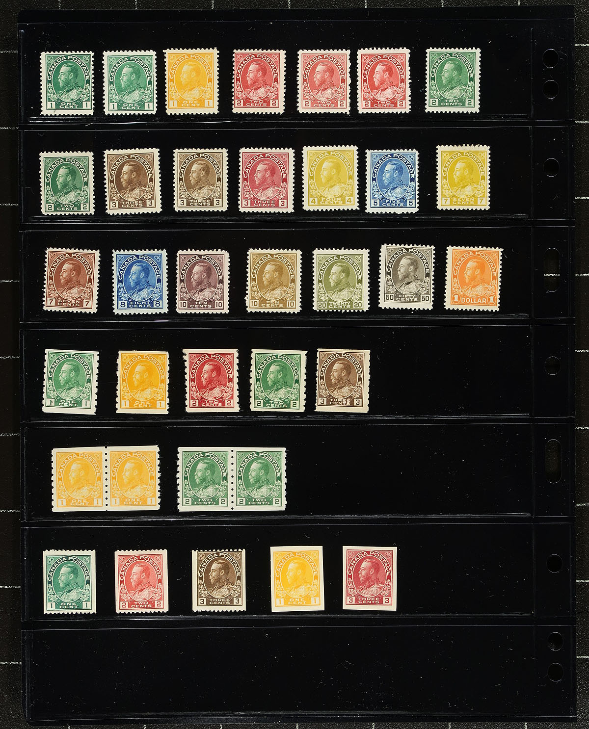 Collection of mint Canada, 1870-1952, containing roughly 300 stamps in 10 Vario-style stock pages. This fairly well organized collection ranges from Scott #35/319, including sets, partial sets, coils, etc. We note a few mint Small Queens, Jubilees (including 10c, c.v. $175), low denomination Leafs, Numerals and Edwards, and Quebecs from 1/2c to 7c (c.v. $340 total). The collection continues with a near complete set of Admirals (missing #112, $1,225 total), along with part set of Scroll and Arch issues, with complete sets of Medallion, Pictorials, War, and Peace issues. The lot rounds out with a small selection of airmails and special delivery issues, with some stamps cataloguing $10 to $30 and up. Current 2026 Scott catalogue value for the collection totals $5,925.00 ($7998.75 CDN). A spot check indicated some stamps having gum disturbance from previous mounts, hinge remnants, and a few small faults, along with several lightly hinged stamps. Still a good lot of classic Canada, overall fine to better. Estimate =