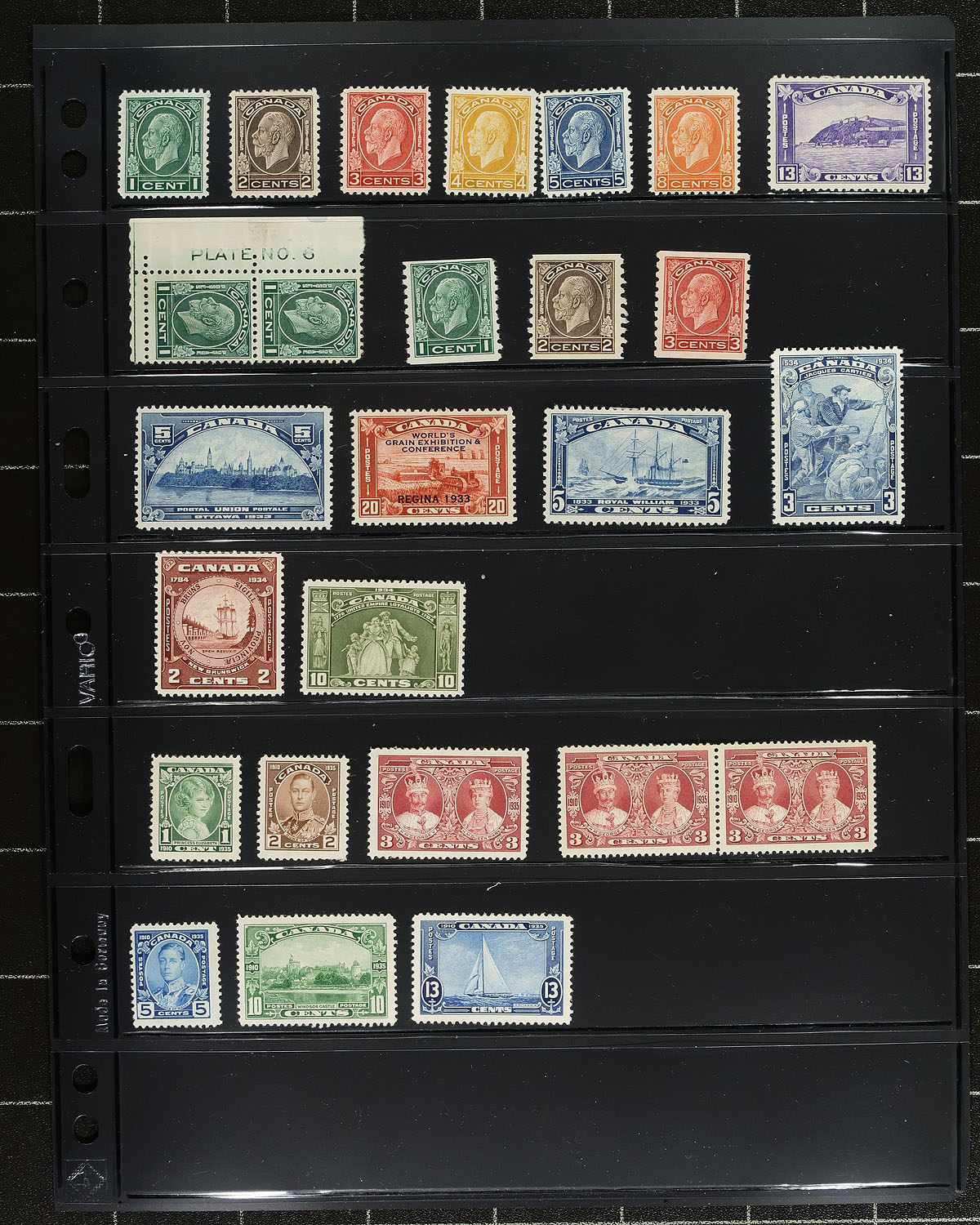 Collection of mint Canada, 1870-1952, containing roughly 300 stamps in 10 Vario-style stock pages. This fairly well organized collection ranges from Scott #35/319, including sets, partial sets, coils, etc. We note a few mint Small Queens, Jubilees (including 10c, c.v. $175), low denomination Leafs, Numerals and Edwards, and Quebecs from 1/2c to 7c (c.v. $340 total). The collection continues with a near complete set of Admirals (missing #112, $1,225 total), along with part set of Scroll and Arch issues, with complete sets of Medallion, Pictorials, War, and Peace issues. The lot rounds out with a small selection of airmails and special delivery issues, with some stamps cataloguing $10 to $30 and up. Current 2026 Scott catalogue value for the collection totals $5,925.00 ($7998.75 CDN). A spot check indicated some stamps having gum disturbance from previous mounts, hinge remnants, and a few small faults, along with several lightly hinged stamps. Still a good lot of classic Canada, overall fine to better. Estimate =