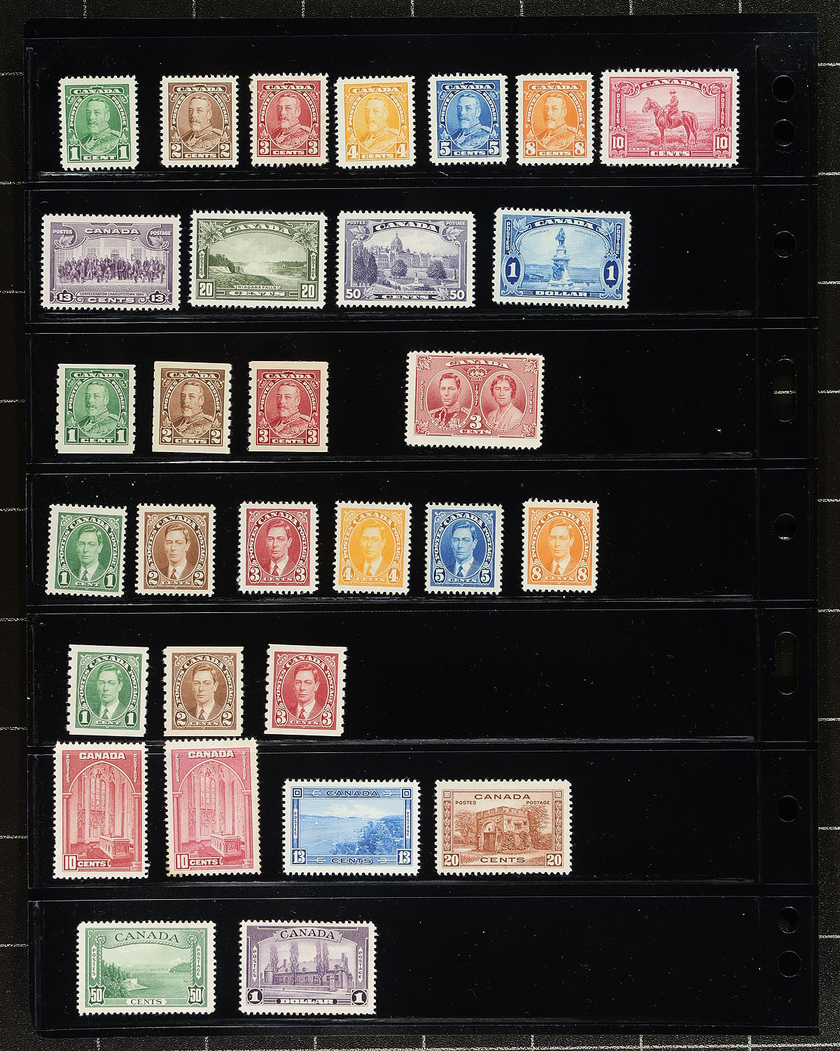 Collection of mint Canada, 1870-1952, containing roughly 300 stamps in 10 Vario-style stock pages. This fairly well organized collection ranges from Scott #35/319, including sets, partial sets, coils, etc. We note a few mint Small Queens, Jubilees (including 10c, c.v. $175), low denomination Leafs, Numerals and Edwards, and Quebecs from 1/2c to 7c (c.v. $340 total). The collection continues with a near complete set of Admirals (missing #112, $1,225 total), along with part set of Scroll and Arch issues, with complete sets of Medallion, Pictorials, War, and Peace issues. The lot rounds out with a small selection of airmails and special delivery issues, with some stamps cataloguing $10 to $30 and up. Current 2026 Scott catalogue value for the collection totals $5,925.00 ($7998.75 CDN). A spot check indicated some stamps having gum disturbance from previous mounts, hinge remnants, and a few small faults, along with several lightly hinged stamps. Still a good lot of classic Canada, overall fine to better. Estimate =