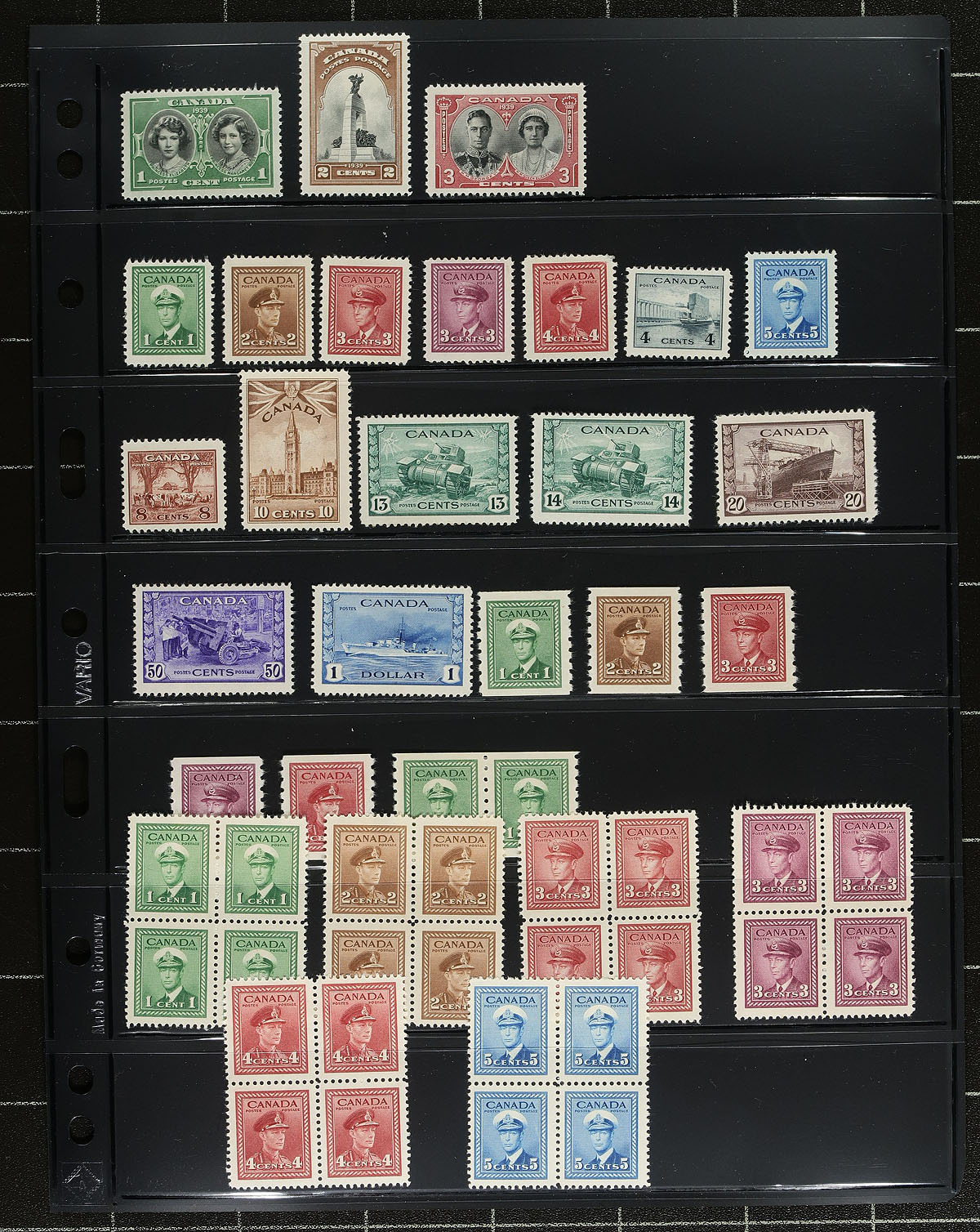 Collection of mint Canada, 1870-1952, containing roughly 300 stamps in 10 Vario-style stock pages. This fairly well organized collection ranges from Scott #35/319, including sets, partial sets, coils, etc. We note a few mint Small Queens, Jubilees (including 10c, c.v. $175), low denomination Leafs, Numerals and Edwards, and Quebecs from 1/2c to 7c (c.v. $340 total). The collection continues with a near complete set of Admirals (missing #112, $1,225 total), along with part set of Scroll and Arch issues, with complete sets of Medallion, Pictorials, War, and Peace issues. The lot rounds out with a small selection of airmails and special delivery issues, with some stamps cataloguing $10 to $30 and up. Current 2026 Scott catalogue value for the collection totals $5,925.00 ($7998.75 CDN). A spot check indicated some stamps having gum disturbance from previous mounts, hinge remnants, and a few small faults, along with several lightly hinged stamps. Still a good lot of classic Canada, overall fine to better. Estimate =