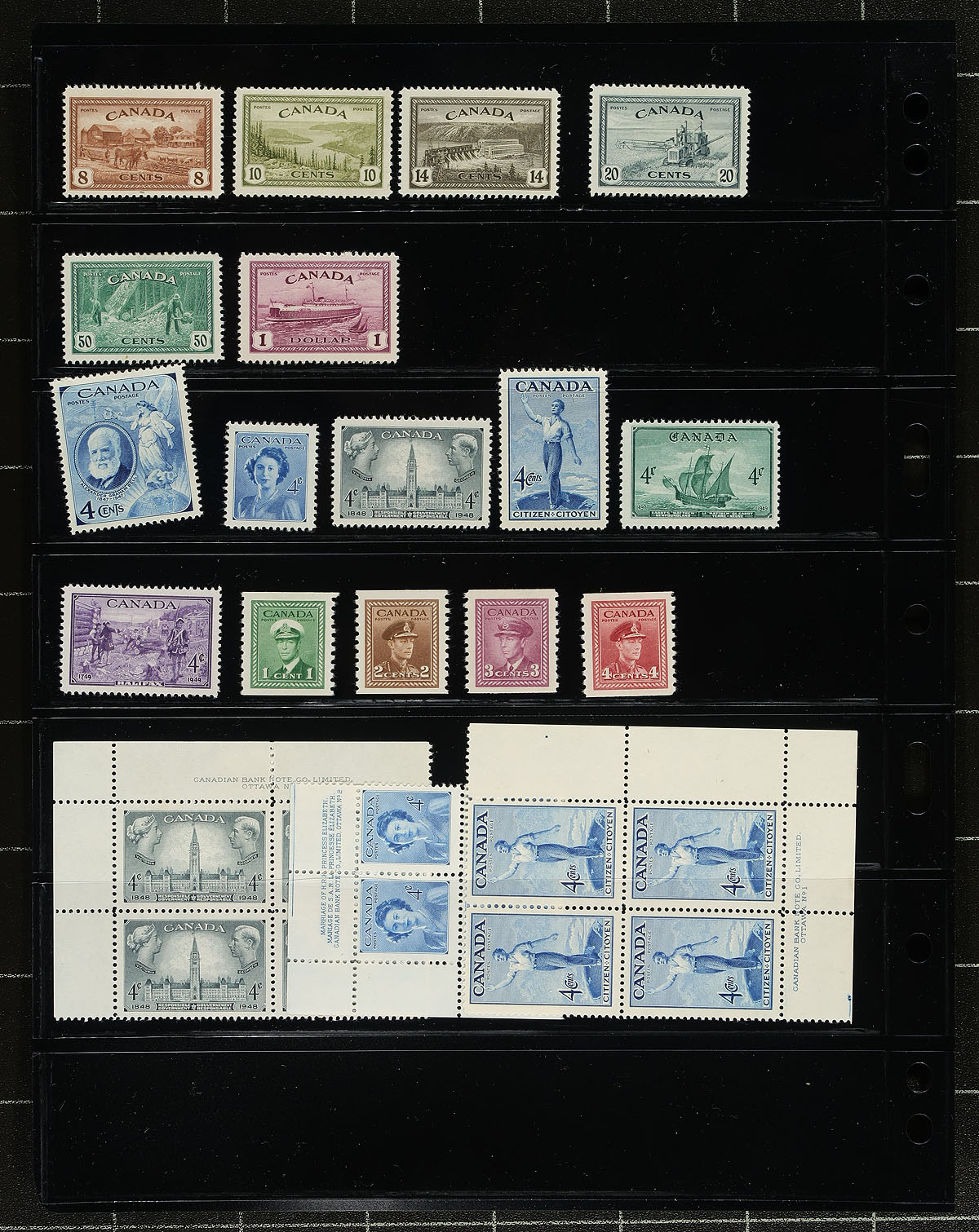 Collection of mint Canada, 1870-1952, containing roughly 300 stamps in 10 Vario-style stock pages. This fairly well organized collection ranges from Scott #35/319, including sets, partial sets, coils, etc. We note a few mint Small Queens, Jubilees (including 10c, c.v. $175), low denomination Leafs, Numerals and Edwards, and Quebecs from 1/2c to 7c (c.v. $340 total). The collection continues with a near complete set of Admirals (missing #112, $1,225 total), along with part set of Scroll and Arch issues, with complete sets of Medallion, Pictorials, War, and Peace issues. The lot rounds out with a small selection of airmails and special delivery issues, with some stamps cataloguing $10 to $30 and up. Current 2026 Scott catalogue value for the collection totals $5,925.00 ($7998.75 CDN). A spot check indicated some stamps having gum disturbance from previous mounts, hinge remnants, and a few small faults, along with several lightly hinged stamps. Still a good lot of classic Canada, overall fine to better. Estimate =