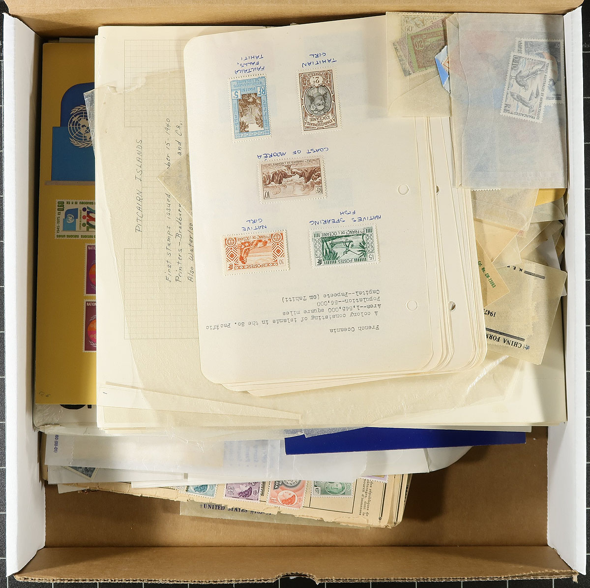 Consignment remainders of mint and used worldwide stamps, containing a likely few thousand stamps in a variety of formats including stock books, album pages, glassines, and more. Just a cursory check indicated better representation from French Colonies (mint and used stamps in several glassines, album pages, and a stockbook), several album pages of used Pitcairn Islands (noting used 1949 Silver Wedding high value, c.v. $52.50), along with British Commonwealth material and more, noting the majority of material appearing to range from the 1930s to the 1960s. A nice lot with possible finds for the worldwide collector. Estimate =